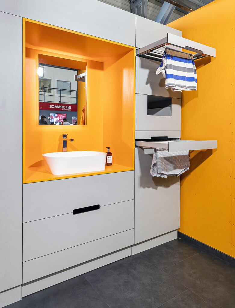 1. Hodiť by sa vám mohli napríklad integrované sušiaky v kúpeľňovej skrinke. Tie jednoducho nahradia klasický sušiak a pomôžu s dosušením vlhkej bielizne. Nejde o žiadne špeciálne kovania. Vtip je len v kvalitnom výsuve doplnenom o aretáciu. Namiesto klasickej dosky je medzi výsuvným kovaním rad relingov (tyčiek) v dostatočnom rozstupe. Na zasunutie stačí zdvihnúť páčku z boku, čím sa „odaretuje“ a sušiak sa jednoducho zasunie späť do skrinky. Táto vychytávka zaberie v skrinke minimálny priestor a problém, kam uložiť sušiak, je úplne vyriešený.