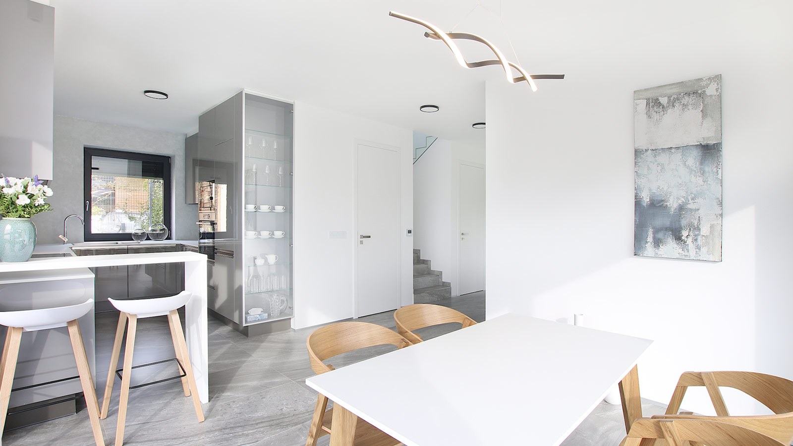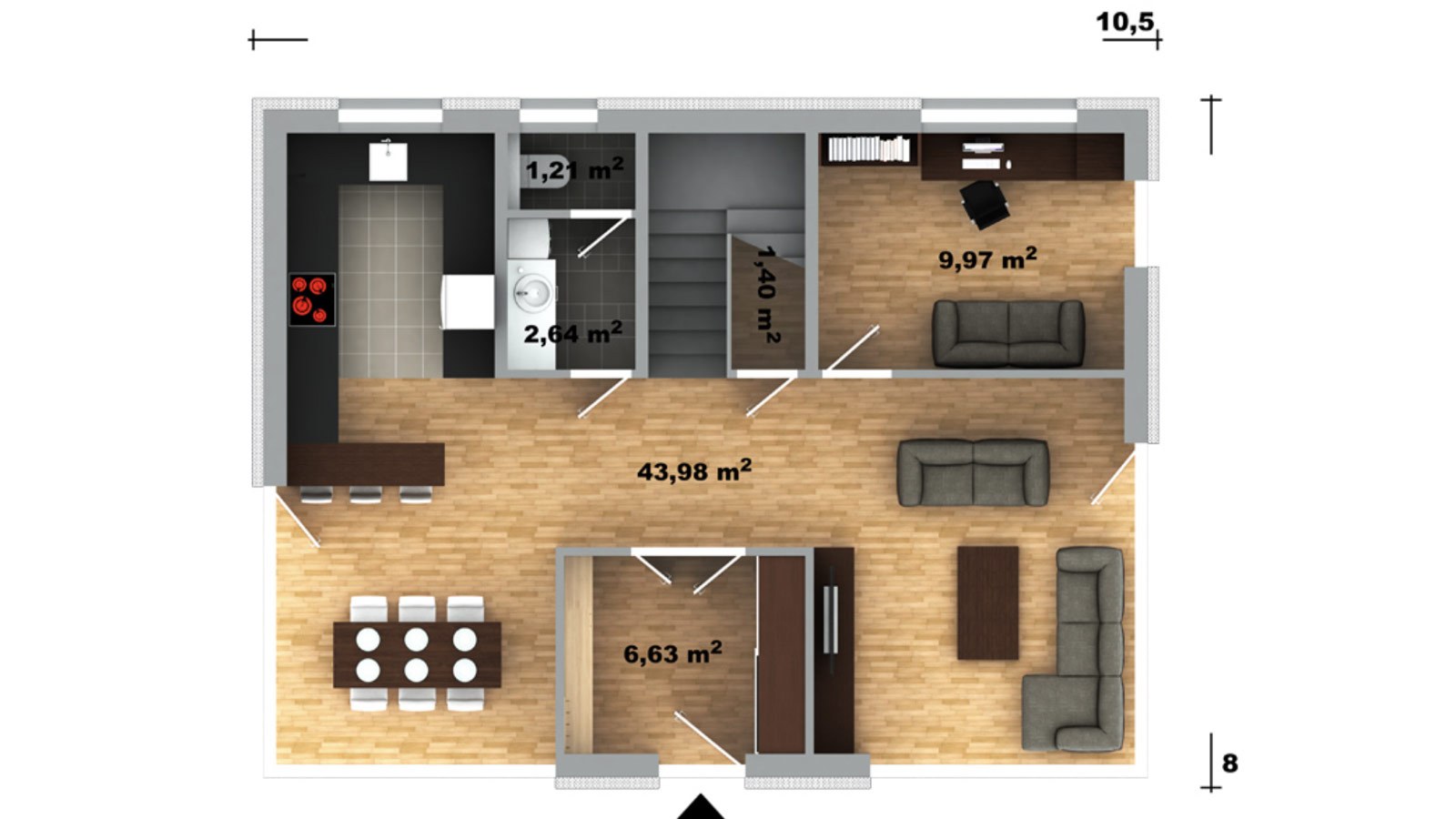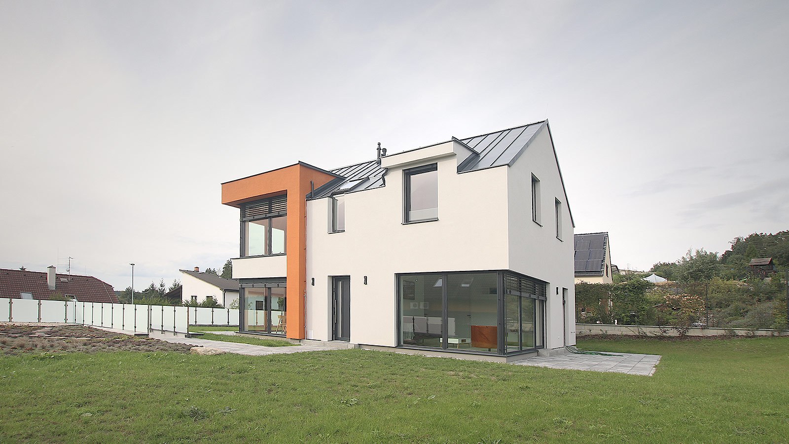 Hlavná hmota domu je archetypálneho vzhľadu, drží si štandardný sklon strechy a čiastočnú pravidelnosť rozmiestnenia okien. Do konzervatívnej a až základnej hmoty sa však nabúravajú výrazné moderné kvádre, ktoré dom významným spôsobom otvárajú a vzhľadovo prebúdzajú. Najväčší kváder je zaseknutý do priestoru jedálne a hlavnej spálne. Rohové otvorenie týchto zásadných miestností v dome dáva skutočne silné pocity voľnosti, bez uzatvárania sa pred okolím. Výhľad sa tu stáva zásadným a najlepším prvkom interiéru. Menšie kvádre zaseknuté do strechy pripomínajú vikiere, ich veľkosť a umiestnenie však ponúkajú oveľa viac ako len výhľad malým okienkom von. Na mieste týchto okien vzniká útulné posedenie. Hlavný priestor prízemia sa rozpína cez významnú časť domu a nájdeme tu jedáleň, kuchyňu a obývaciu izbu. Všetky časti opticky oddelené, napriek tomu vo vzájomnom kontakte. Technické a prevádzkové zázemie domu je samozrejmosťou, a k nemu sa ešte zmestila pracovňa, vhodná aj ako hosťovská izba.