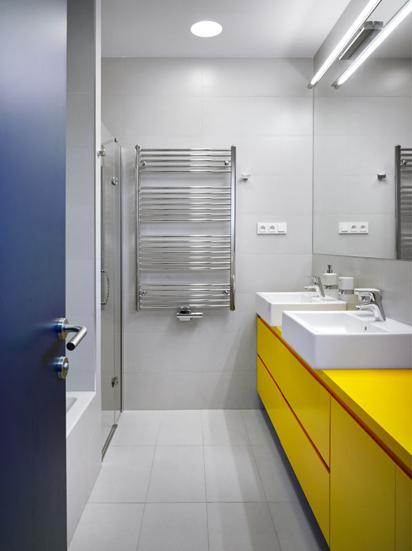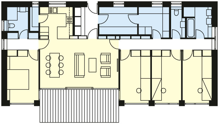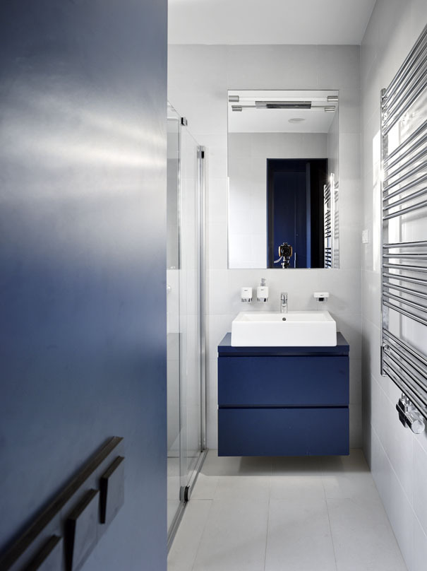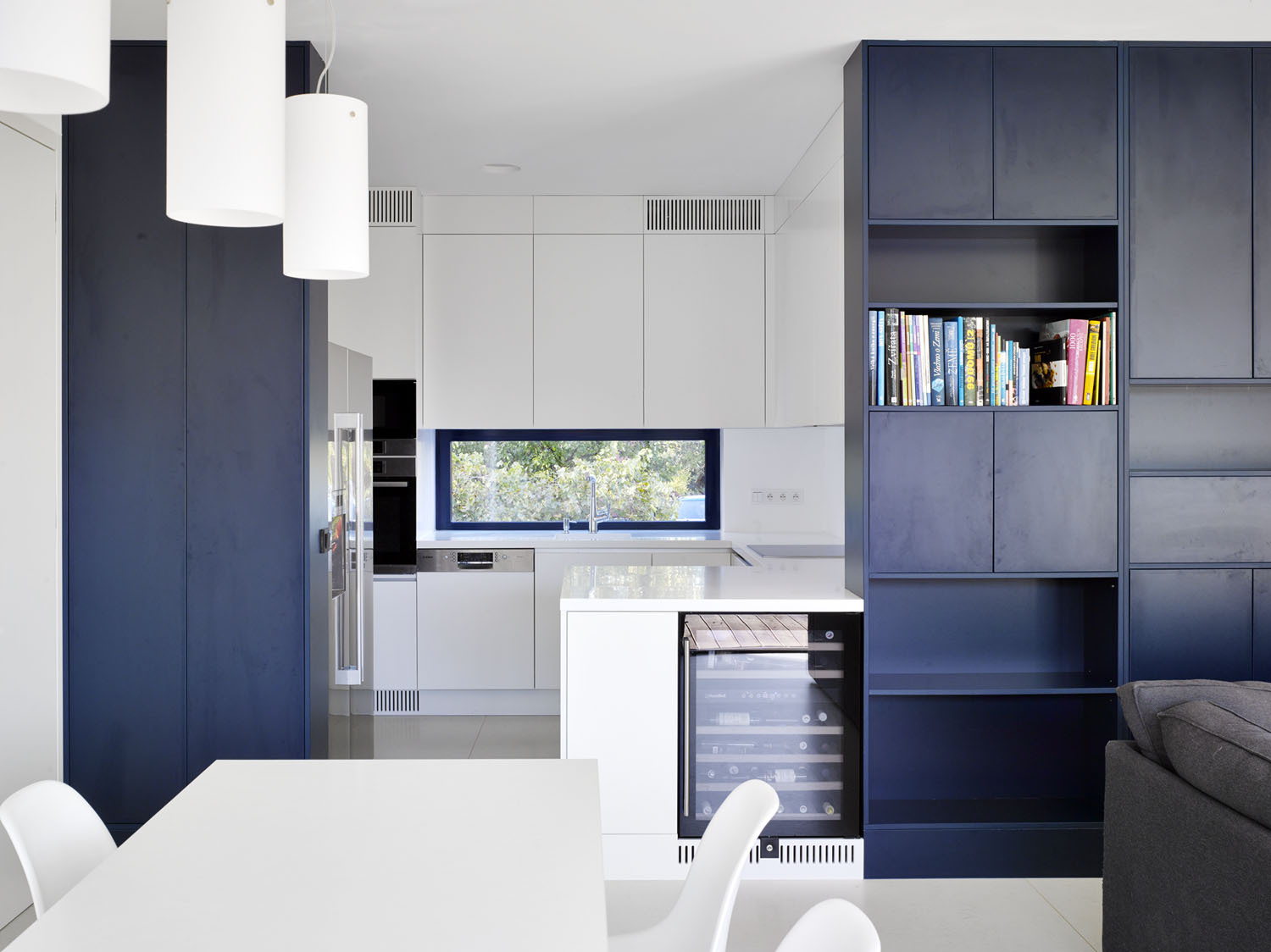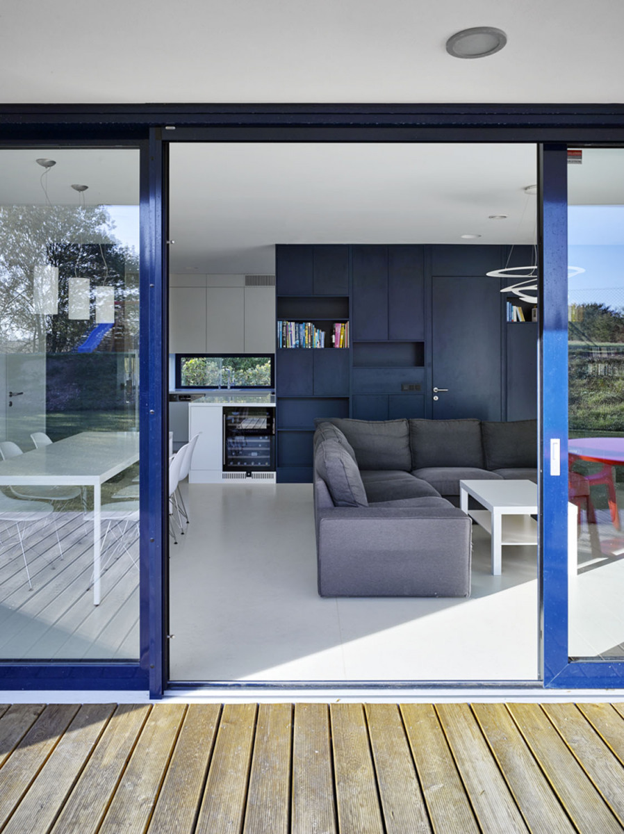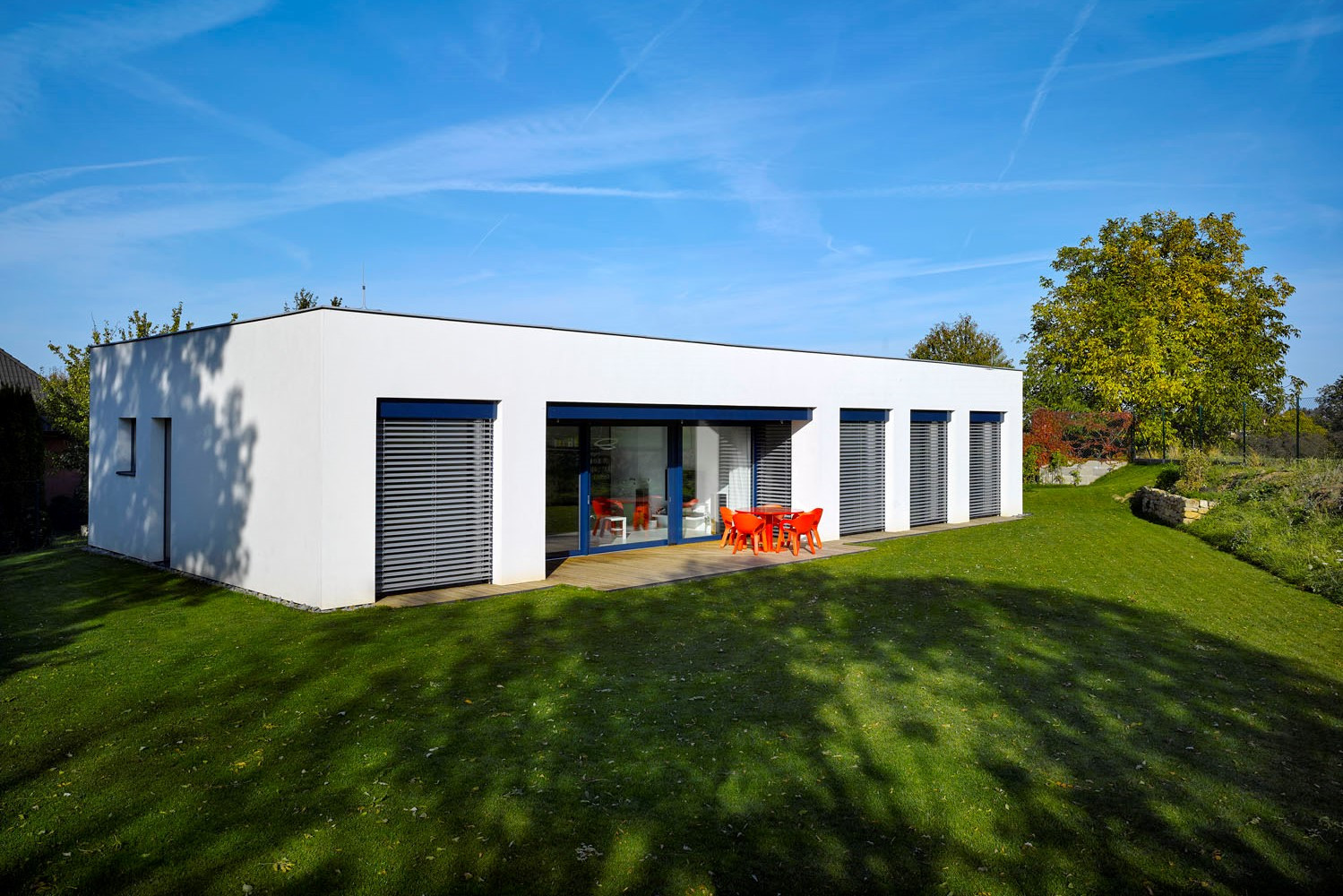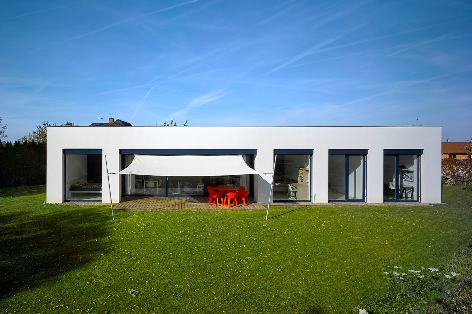Jednoduchá prízemná stavba je úplne obrátená do záhrady, mierne zníženej oproti úrovni ulice. Medzi okolitou zástavbou nie je takmer vidieť a ponúka príjemné súkromie. Aby nebol narušený jednoduchý kompaktný tvar, čiastočne terasu tieni len ľahká plachta. Dom má technologicky nepríliš náročný konštrukčný systém z dierovaných tehál s vonkajším kontaktným zateplením a stropom z predpätých panelov, energetickú úspornosť stavby zvyšuje riadené vetranie s rekuperáciou tepla. Základom úspornosti je jednoduchá a prehľadná dispozícia, ktorá maximálne využíva zastavanú plochu. Dom v tvare kvádra je pozdĺžnou chodbou rozdelený na severný trakt s hospodárskymi priestormi (zádverie, šatne, kúpeľne, WC a kuchyňa), obytné miestnosti sú orientované na juh. Francúzske okná na každom konci zaisťujú prirodzené denné osvetlenie, prepojenie so záhradou aj pozdĺžne prevetranie stavby. Farebná kombinácia je inšpirovaná 30. rokmi 20. storočia, rovnako ako racionálne usporiadanie celého domu. Modrobiela farebná kombinácia sa opakuje aj v interiéri, ktorý bol z prevažnej časti vyrobený na zákazku podľa návrhu architektov.