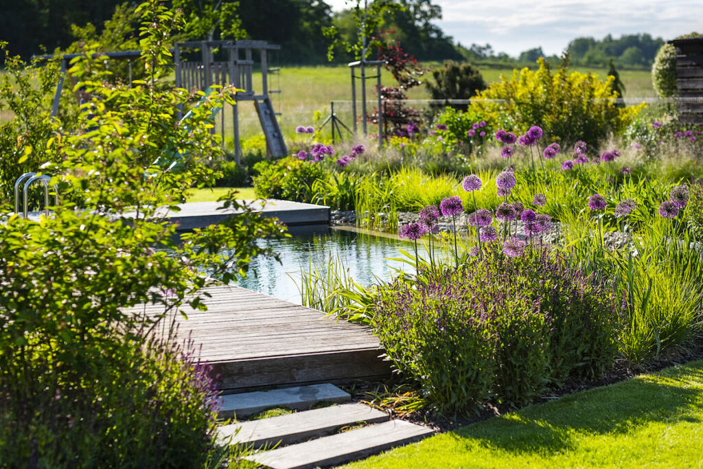 Biobazén je tvarovo veľmi jednoduchý, umiestnený mierne nad terénom, kde sa dobre stráca v okolitých výsadbách. Tie súčasne zjemňujú tvrdosť pravouhlých foriem do záhradnej kompozície. Všetko je jednoduché a elegantné. Výsadbu prepája niekoľko nášľapných chodníkov, ktoré vtipne aj prakticky skracujú trasy medzi jednotlivými aktivitami. Kvety, kríky a stromy záhradu tak postupne vtiahnu späť do okolitej krajiny. Namiesto ihličín a sakury budú záhrade vládnuť žeriavy, muchovníky, ovocné stromy a kríky. Miesto na ohnisko a na pestovanie zeleniny sa spojilo do jedného priestoru. Herné prvky sa zapojili do záhrady pomocou výsadieb a budú slúžiť, kým deti nevyrastú. Preto sú začlenené do organizmu záhrady tak, že umožňujú rodičom dohľad, zároveň nerušia kompozíciu, a až nebudú potrebné, jednoducho zmiznú – a záhrada bude žiť ďalej.