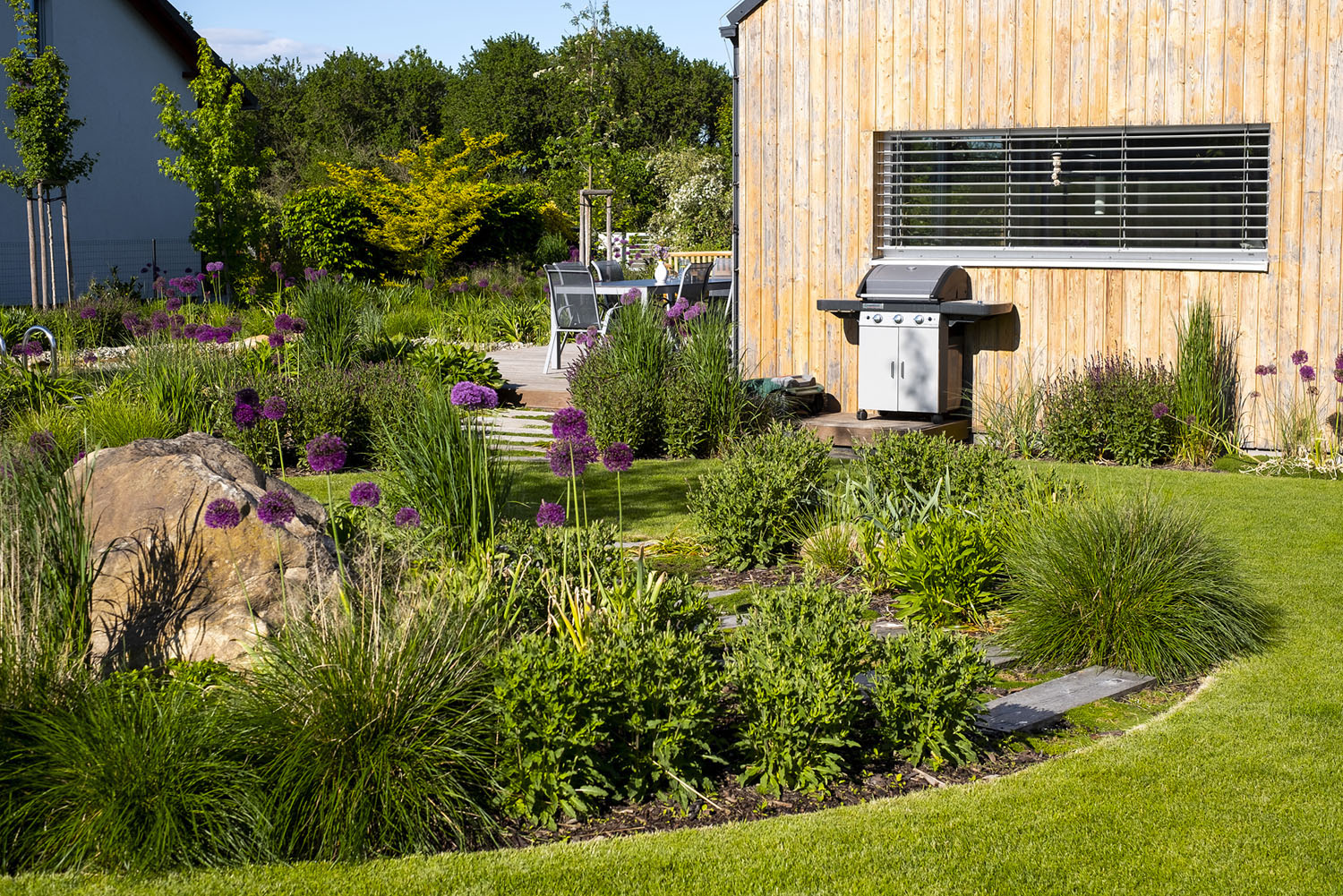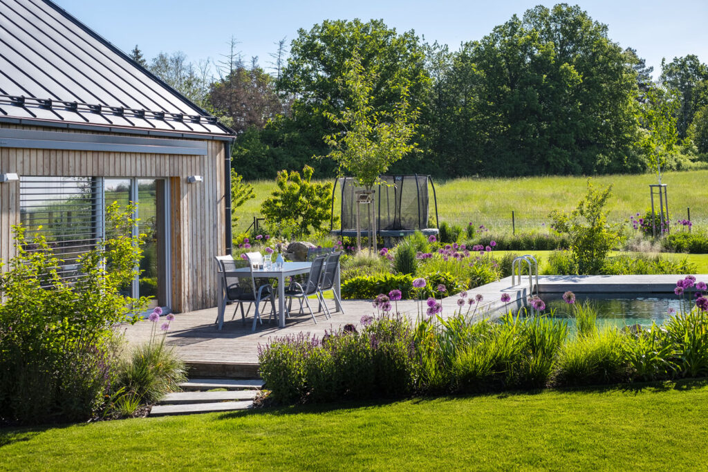 Na dom sa z jednej strany pripája technický vstup pre auto a v predĺžení úžitková záhrada. Z druhej strany jednoduchá kompozícia vo voľných krivkách (zelené ostrovy v trávnikovom mori) vytvára priestor pre jednotlivé funkcie – herné prvky pre deti, zelenina a ovocie, posedenie s ohniskom a okrasné výsadby sprevádzané solitérnymi kameňmi. Pohodlný každodenný pohyb zaistili mlatové povrchy a drevené terasy pri dome, na ktoré prirodzene nadviazala vodná plocha obalená trvalkami.