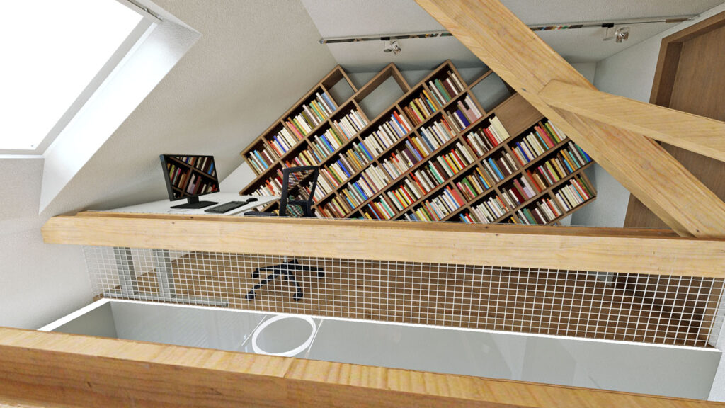 Obývačka má veľkoryso otvorený strop – vytvára galériu do druhého nadzemného podlažia. Tu sa nachádza malá pracovňa s atypicky riešenou knižnicou