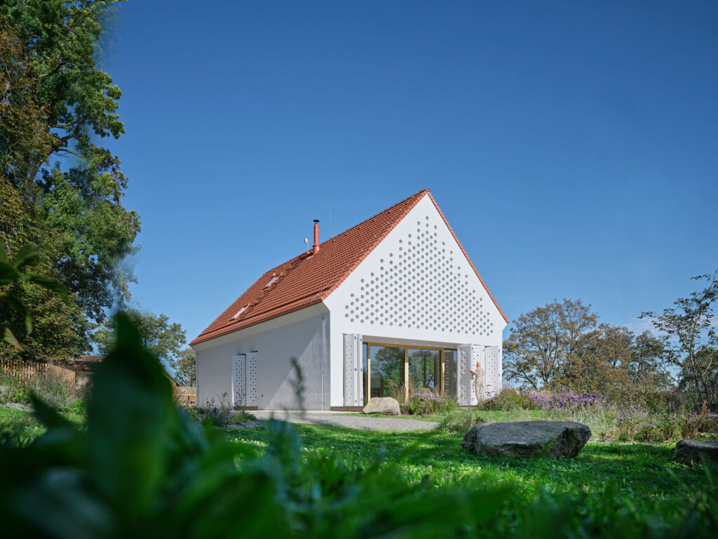 Dom sa nachádza blízko obce, kde sú kamenné alebo tehlové stavby s bielou vápennou alebo štukovou omietkou a keramickou strešnou krytinou. Ponúkalo sa teda tradičné vidiecke riešenie. Autor projektu využil iba jedno krídlo z pôvodného statku, takže stavba má jednoduchý pôdorys aj tvar. Podobá sa tak starým stodolám, tento motív ešte podporila perforovaná fasáda: „Pôvodne som predpokladal, že vyjdeme zo vzoru, ktorý všetci poznáme. Zhodou okolností kúsok od nás stojí stodola, ktorá má vetracie otvory v module 15 × 15 cm, vynechávala sa vždy polovica tehly. Firma však prišla s tým, že vytvoriť niekoľko stoviek štvorcových otvorov nebude úplne jednoduché. Navrhli, že ich do steny vyvŕtajú. Jedna vec je totiž otvor vymurovať, ďalšia však opatriť ho omietkou – štvorček s čistými hranami je pre tieto práce oveľa zložitejší ako kruh. Vŕtanie ale išlo prekvapivo hladko, trvalo asi týždeň – pripravili si šablónu veľkú zhruba 1,5 × 1,5 metra a používali špeciálny vrták.“
