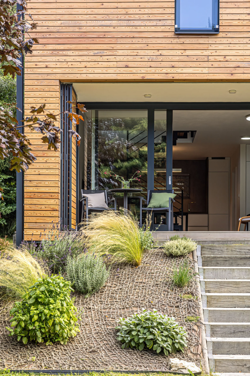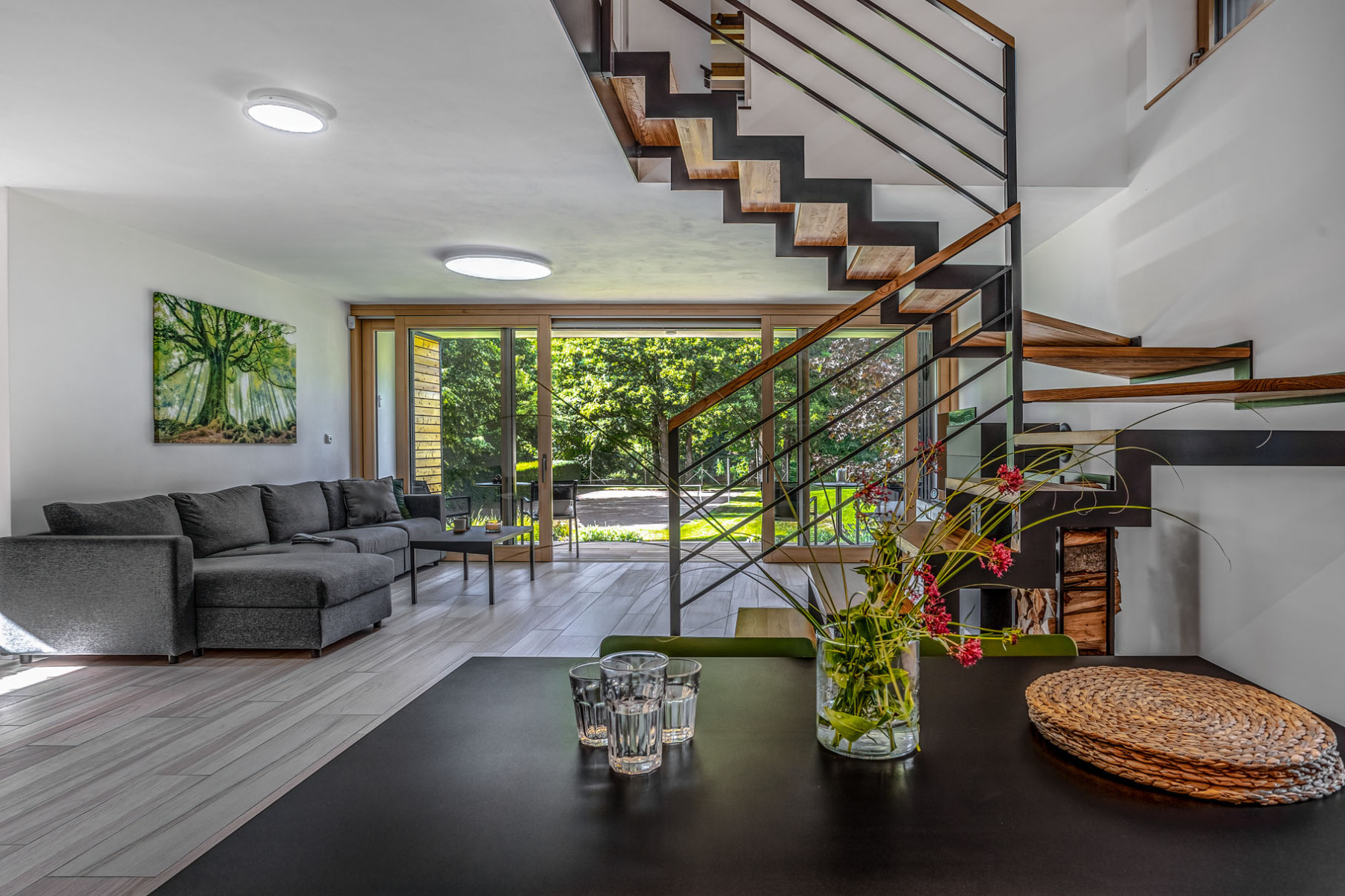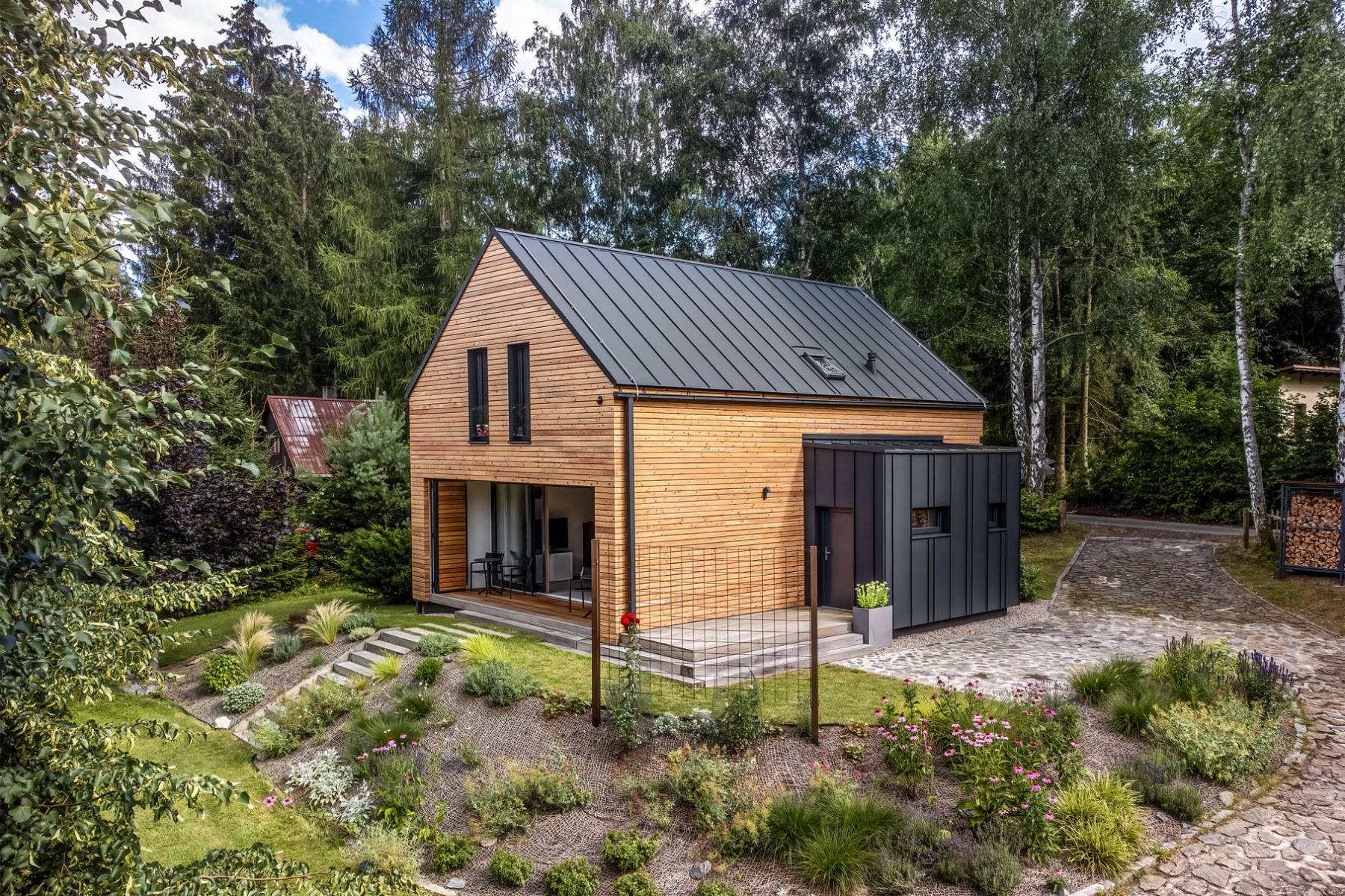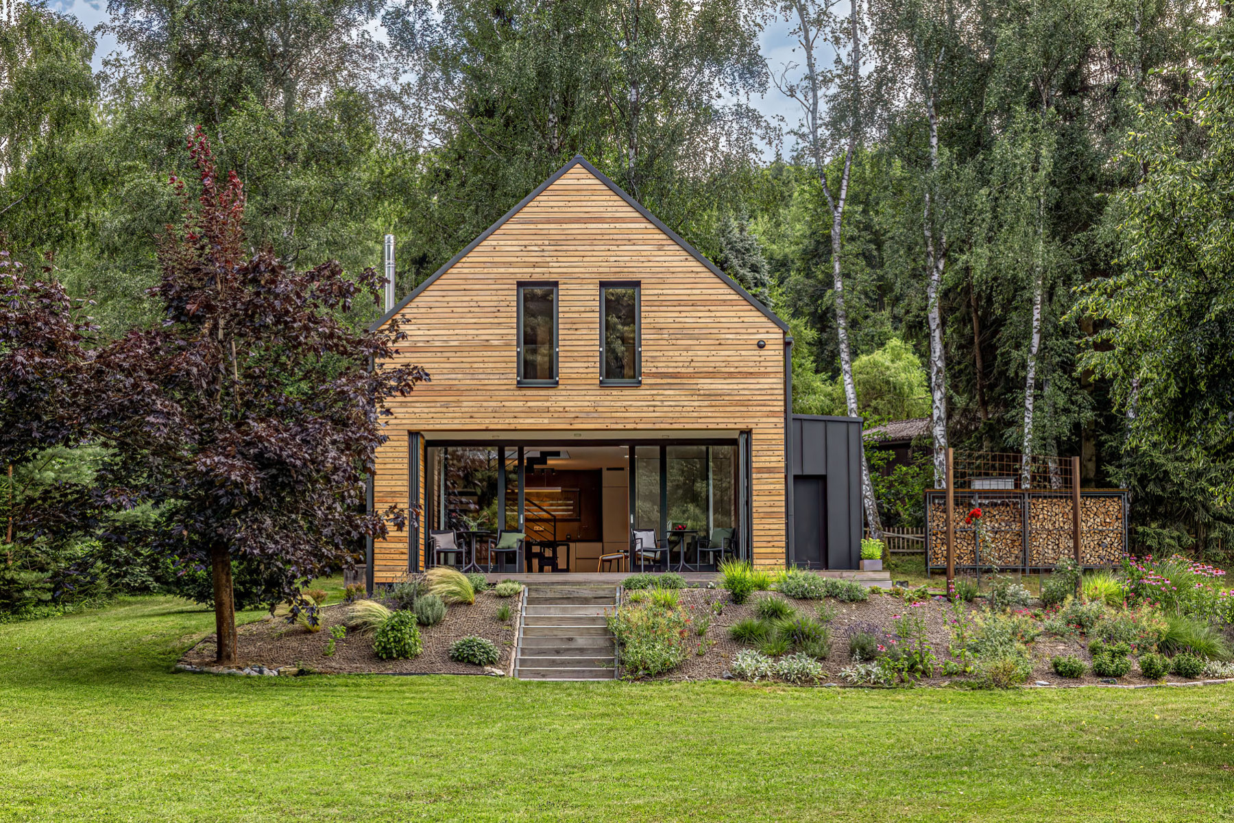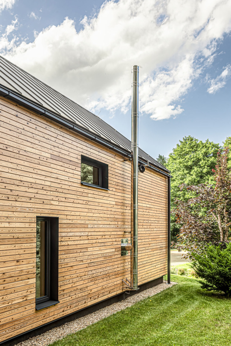 Rekreačný dom bol postavený pri rieke na pôvodnej základovej doske s plochou 78 m2. Ide o murovanú stavbu zo stavebnice HELUZ s vetraným plášťom zo sibírskeho neupraveného smrekovca. Obvodové murivo je z tehál HELUZ Family, stropy keramické HELUZ, drevený tesársky krov, strešná krytina hliníková PREFALZ, zádverie – obklad fasády z falcovaných plechov PREFALZ. Malým zádverím na západnej strane sa vchádza priamo do obývacieho priestoru s kuchyňou, jedálenským stolom a sedením. Zaberá takmer celé prízemie (okrem kúpeľne a technickej miestnosti). Z obývacej časti sa vychádza širokým HS portálom na zapustenú terasu, ktorú možno zvonku úplne uzavrieť špeciálne na mieru vyrobenou zhrňovacou stenou z drevených panelov. Tá slúži aj ako ochrana pred únikom tepla a tiež ako ochrana proti zlodejom, keď je dom prázdny.