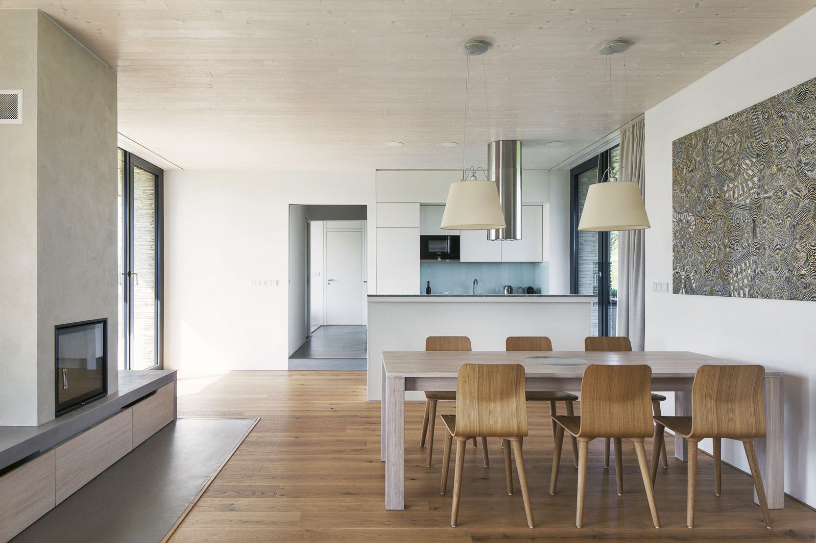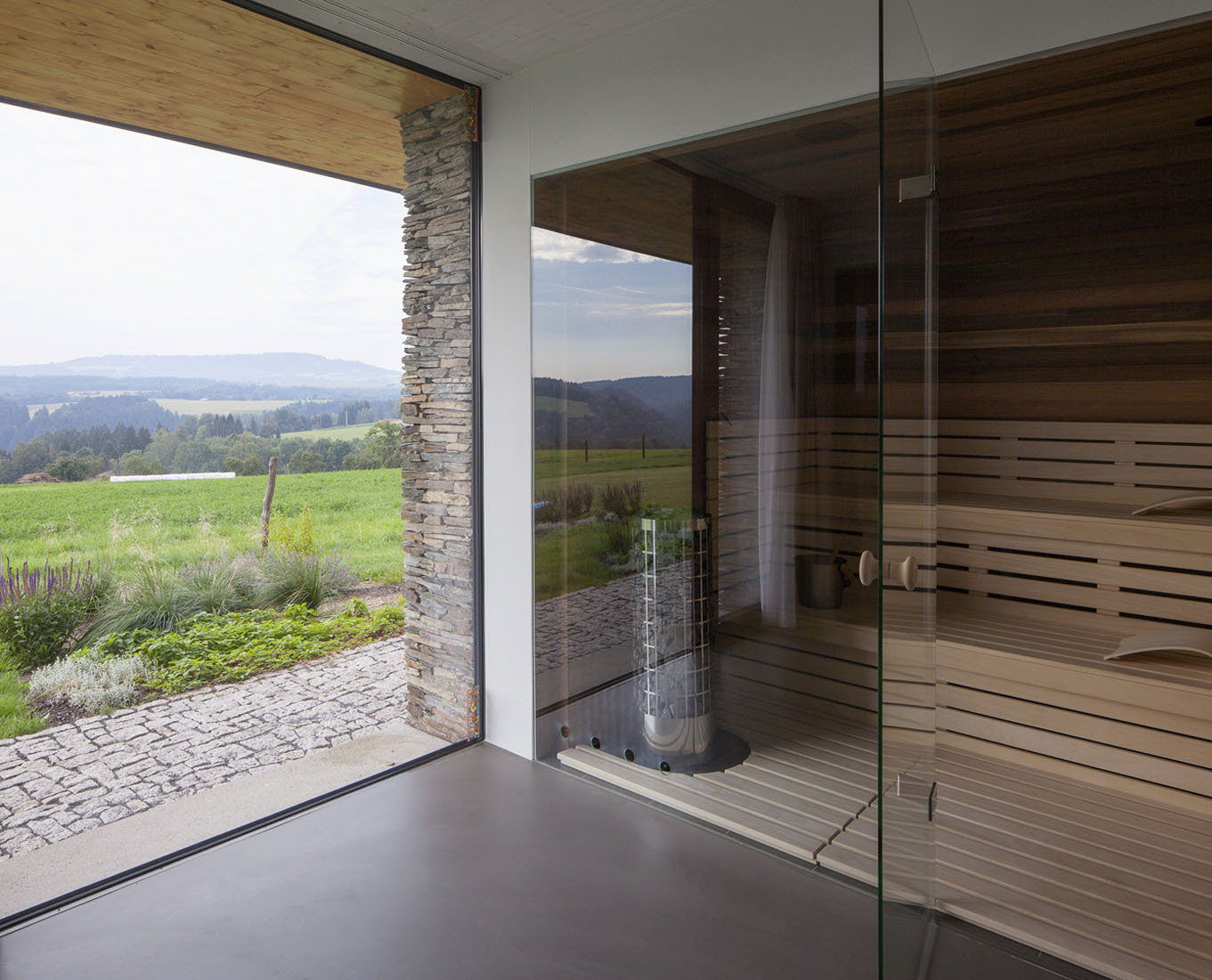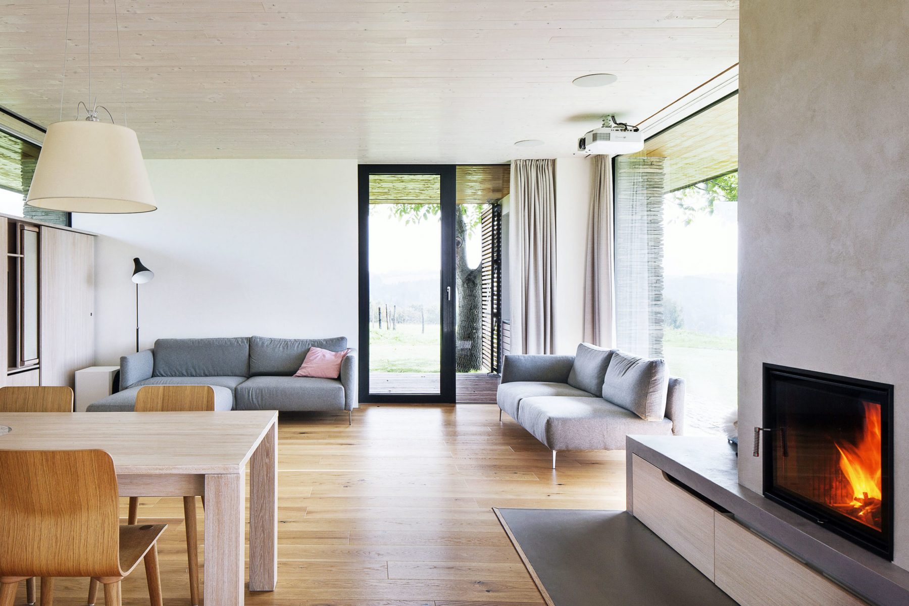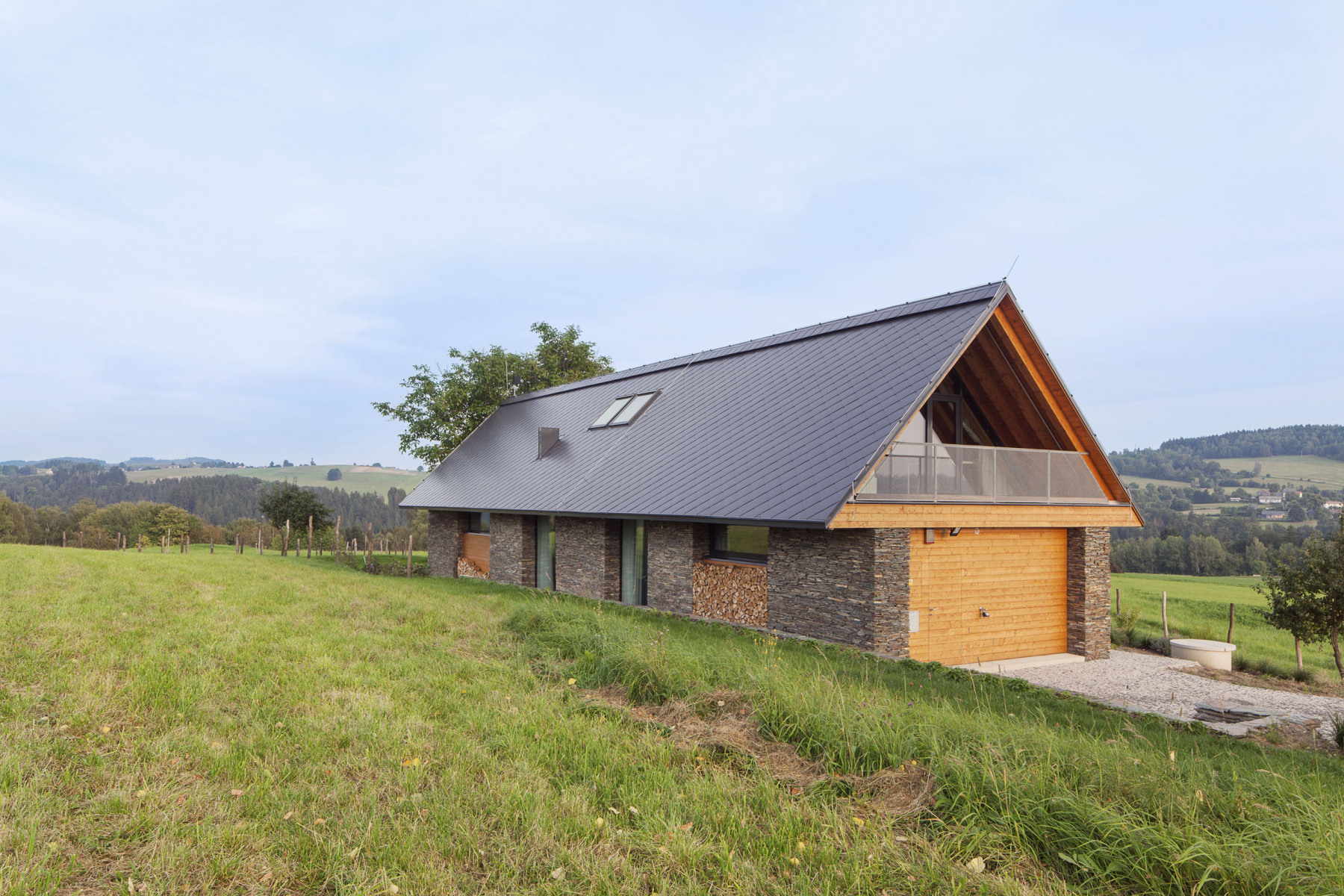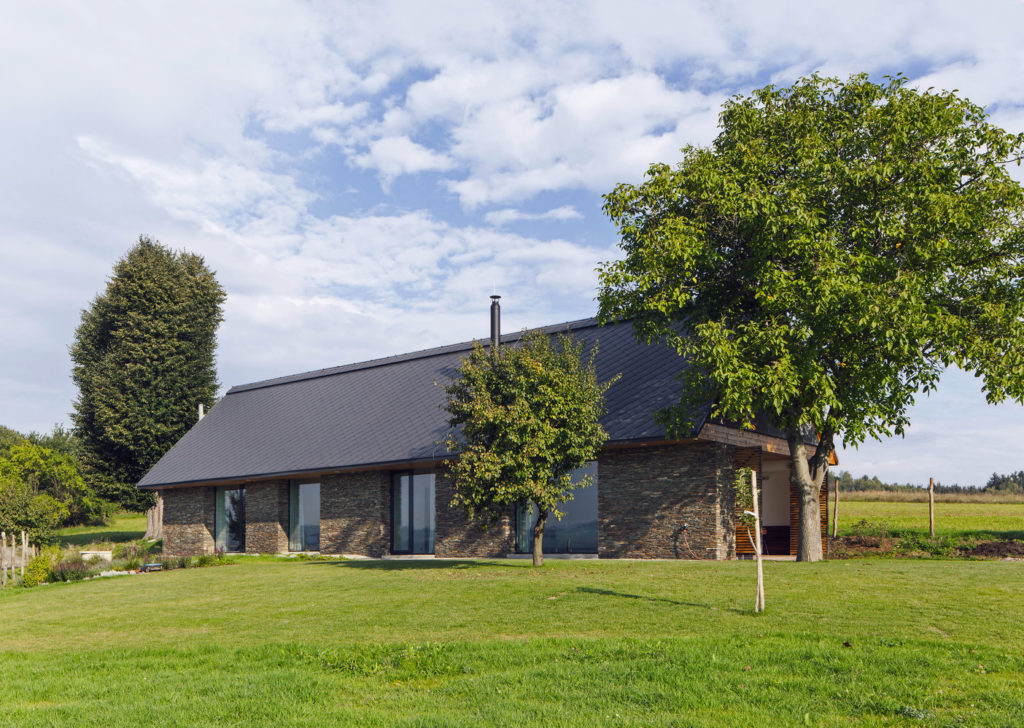 „Dom za dedinou, kde stála malá chalupa. Za lipou a pred gaštanom, s výhľadom do ďalekého kraja.“ Tak charakterizujú architekti z ateliéru ov-a stavbu určenú na dlhodobú relaxáciu štvorčlennej rodiny a pokračujú: „Nový dom prevzal tvaroslovie stodôl uprostred lúk. Medzi kamennými piliermi sú zovreté priestory zázemia, v otvorených poliach voľnosť. A strecha s konštrukciou čistého trojuholníka.“ Čo dodať?