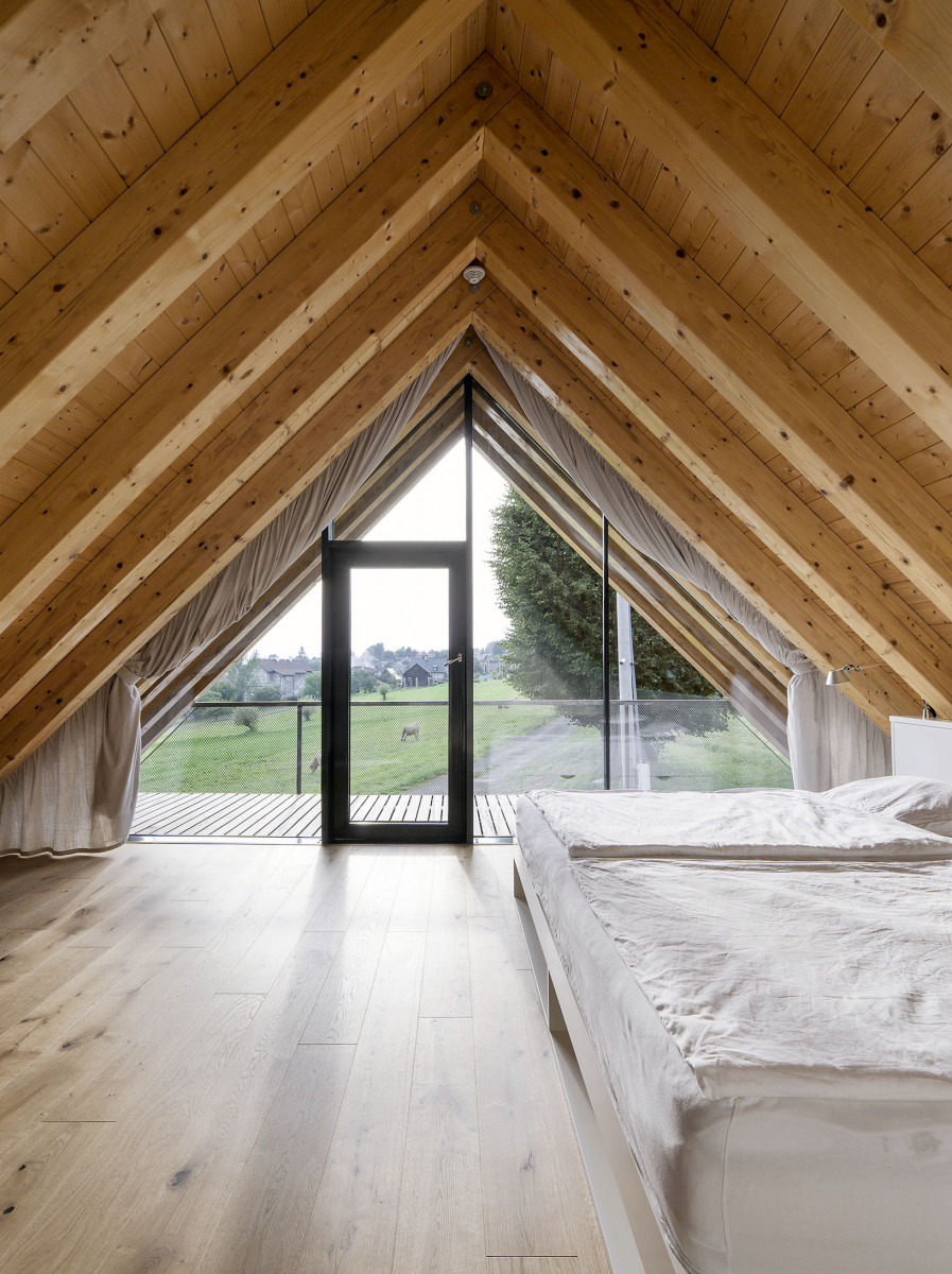 Ale späť k prvému projektu: Najväčšou výzvou bola výnimočná poloha pôvodnej chalupy. „Na exponovanom mieste, kam vidieť zďaleka, stál domček z kameňa lepeného hlinou. Bol nízky, úzky, roztomilá chalúpka, pre klienta však nepoužiteľná,“ hovorí architekt. Namiesto rekonštrukcie existujúcej stavby rozhodli súčasné nároky na obytný priestor a technickú vybavenosť o jej zbúraní.