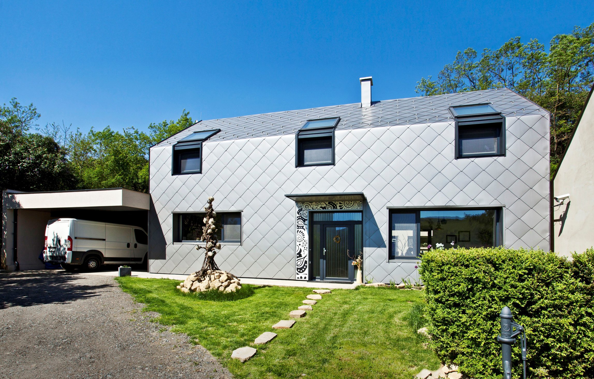 Štvorčlenná rodina túžila po pokoji a zdravom prostredí vidieka. Kúzlo vysnívaného našla v pokojnej obci so stáročnou históriou. Nový dom ctí genius loci nielen tvarom, ale aj krytinou z hliníkových šablón, imitujúcou eternitovú strechu blízkeho kostola.