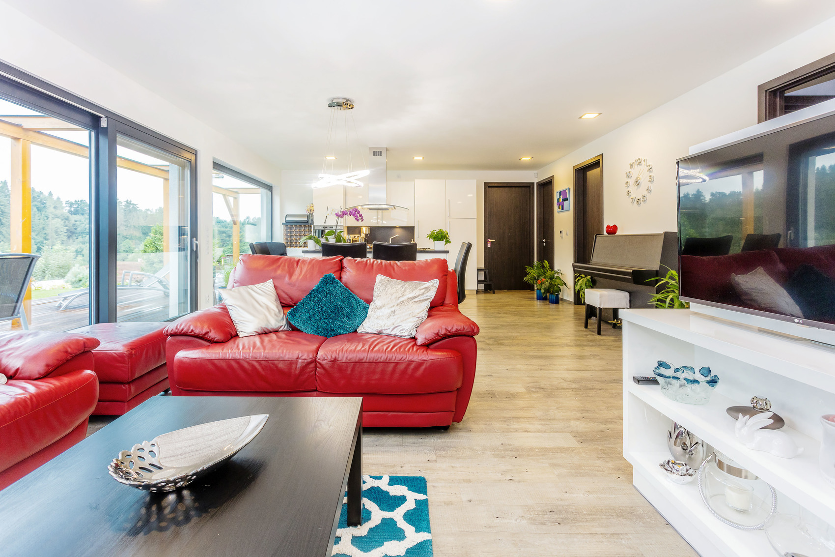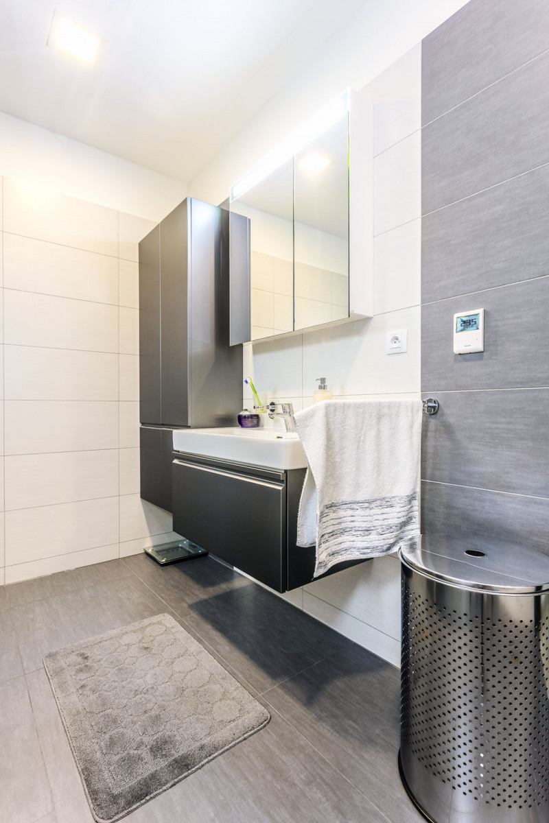 Do domu sa vchádza zo severnej strany, cez zádverie s vstavanou skriňou sa dostanete k malej príručnej toalete a do priestrannej technickej miestnosti s elektrokotlom. Nasleduje ústredná obytná miestnosť, ktorá spája kuchynskú, jedálenskú a obývaciu časť domu. Po stranách sa nachádza rodičovská a detská spálňa s vlastným zázemím.