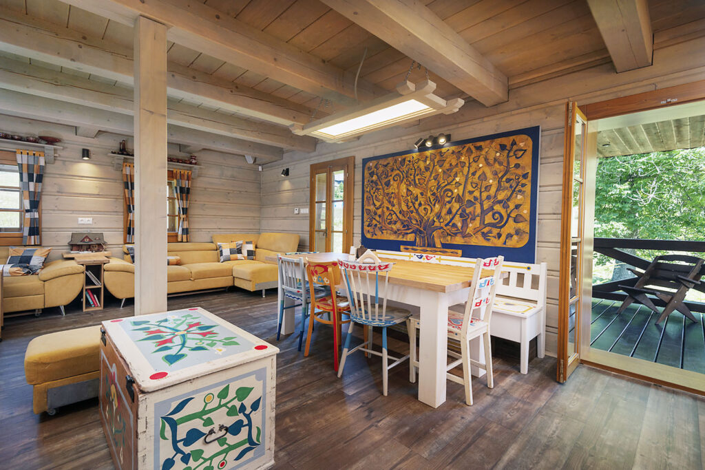 Rázovitá goralská obec Ždiar je známa výraznými folklórnymi prvkami a zachovávaním tradícií predkov. To inšpirovalo majiteľov pri tvorbe moderného interiéru pre výtvarné riešenie, hoci trocha inak. „S rešpektom k tradícii a moderným trendom som šiel vlastnou cestou. Prízemie je preto veľkoryso otvorené, vzdušné a bez priečok, bariér. Jeden veľký otvorený priestor. Objatie voľnou prírodou cítiť tak aj v interiéri. Máme možnosť sa na mieste otáčať na každú svetovú stranu a cez okná pozrieť von, prepojiť sa s exteriérom, so silou vysokohorskej krajiny a majestátnymi štítmi,“ pokračuje Jaroslav Čech. Otvorená kuchyňa s jedálňou je spojená s obývačkou. Toto prepojenie umožňuje spoločné prežívanie všetkých možných aktivít – varenie, stolovanie, hranie spoločenských hier, rozhovory, spoločný čas pri krbe. Smart osvetlenie dotvára jedinečnú atmosféru priestoru. „Do toho priestoru som chcel vstúpiť s vyladenou kompozíciou tvarov, prvkov, farieb. Kde i kontrasty, či akcent sú súčasťou vyváženého celku“, popisuje autor. Najväčšou plochou v kompozícii sú steny. Zvolili sivý odtieň, ktorým sa namoril drevený obklad. Jemná sivá so zvýraznením kresby dreva pôsobí málinko chladivo, upokojujúco, neutrálne, prirodzene. Akoby sme sa pozerali na živé kme- ne stromov, ktoré ešte na jar nemajú listy, ale sú živé. Aj kuchynská linka je vyzdobená motívmi rastlín a kvetov. Namiesto naturálneho zobrazenia prírodných motívov tu prichádza symbolika, štylizácia, náznak. Maľované sú základnými farbami – modrá, červená, žltá, zelená, biela. V kuchynskej čajovo-kávovej skrinke nás prekvapí skupinka vtáčikov. V poličkách, ako v riadkoch písmenká, čítame ich vtipné výrazy. Úmyslom bolo vniesť do dekoratívnej funkcie vtip a radosť. Rovnako pôsobia milé funkčné odkladacie šuplíky. Srdcom chalupy je nepochybne unikátny moderný kozub – výtvarné dielo, vybavený senzormi a automatickou reguláciou, ktorý prieduchmi vykuruje aj vrchné podlažie. Zaoblený roh umožňuje voľný pohyb okolo objektu. Tvar nie je ostrý, využívajú sa v plnej miere obliny. Na steny kozubu použil Jaroslav Čech svoju autorskú výtvarnú techniku. Ide o kolorovanú reliéfnu omietku. „Na kozube som použil prírodné motívy – listy, kvety, byliny, vtáčiky. Každá realizácia na ploche/stene, ktorú vytvorím, je originálna a jedinečná. Ako obraz. Vytvorená na mieru v určenom priestore s jasným zámerom pre konkrétnych ľudí. Inšpirujem sa prírodou, v ktorej žijem, ktorú mám rád. Je to ako zušľachťovať, pretvoriť reliéfy zeme a zemského povrchu do dekoratívnej omietky či obrazu s hlbším prepojením. Ak sa to darí, je dekoratívnosť prekonaná a omietka-obraz vyžaruje príjemnú energiu. Ľudia často zvyknú prechádzať prstami po reliéfe, hladkajú omietky, sú stíšení, upokojení, usmievajú sa,“ preciťuje priestor výtvarník. Kozub je prepojený s ďalšími obrazmi v tomto interiéri. Na stene nad jedálenským stolom visí veľký závesný obraz „Strom hojnosti”. Vytvorený je tiež technikou kolorovanej reliéfnej omietky na doske. Námetom je živý strom v kvetináči, ktorý symbolizuje tradíciu, rod a naše korene, minulosť i budúcnosť.