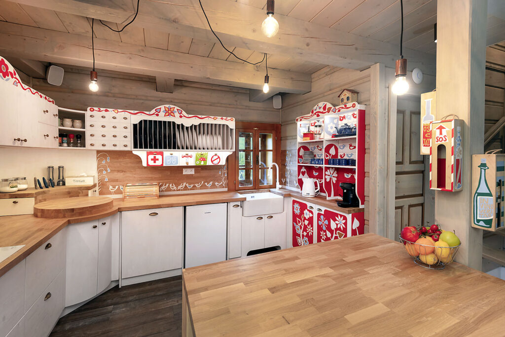 Otvorené schodisko, vybavené pohybovými senzormi s postupným osvetľovaním prepája prízemie s poschodím i pivničným priestorom. Dekoratívna kolorovaná reliéfna omietka sa nachádza aj v dvoch izbách na poschodí. Na najväčších stenách v izbách je vytvorený ucelený obraz. Tematicky ho dopĺňa zdobená vyberateľná okenica, ktorá slúži v noci na zatienenie a cez deň ako obraz zavesený vedľa okna. Vzhľadom na účel týchto izieb – odpočinok, spánok, pôsobia celostenové obrazy jemne až delikátne. Prispôsobená je tomu farebná kompozícia, zladenie pastelových teplých farieb s použitím jemných motívov, v ktorých sa izby navzájom tematicky odlišujú. Obrazy svojím vyžarovaním pútajú prirodzenú pozornosť, zároveň pôsobia upokojujúco až meditatívne, aktivujú radosť a šťastie. Detailné prepracovanie už ako čerešnička na torte dotvára označenie na dverách kopírujúce motívy izby – zvonček pre zvončekovú izbu, hviezda či srdce pre ostatné spálne. Zaujímavo vyriešili majitelia aj priestor pod strechou, ktorý ako otvorená galéria ponúka spanie pre väčšie deti s výhľadom cez mini okienka. Vychádza sa na ňu rebríkom, ktorý zároveň slúži na odkladanie úložných krabíc. Pivničné priestory slúžia pre technické zázemie. Nachádza sa tu aj komora a príjemný barový pult s malým kuchynským kútikom, využívaný najmä v lete, keďže je v blízkosti veľkorysého záhradného altánku, kde nechýba vonkajší kozub či plocha pre elektrický gril a sedenie. Všetok príslušný mobiliár a vybavenie chalupy – stoličky, police, lavice, truhlica a iné praktické predmety ako skrinka na „schlaftrunk“, zásobník na zápalky, drevené obaly spoločenských hier či jedinečná kronika chalupy – sú vyzdobené dekoratívnymi maľbami v jednotnom štýle, ktorý vychádza z konceptu, ktorý autor zvolil pre túto konkrétnu chalupu.