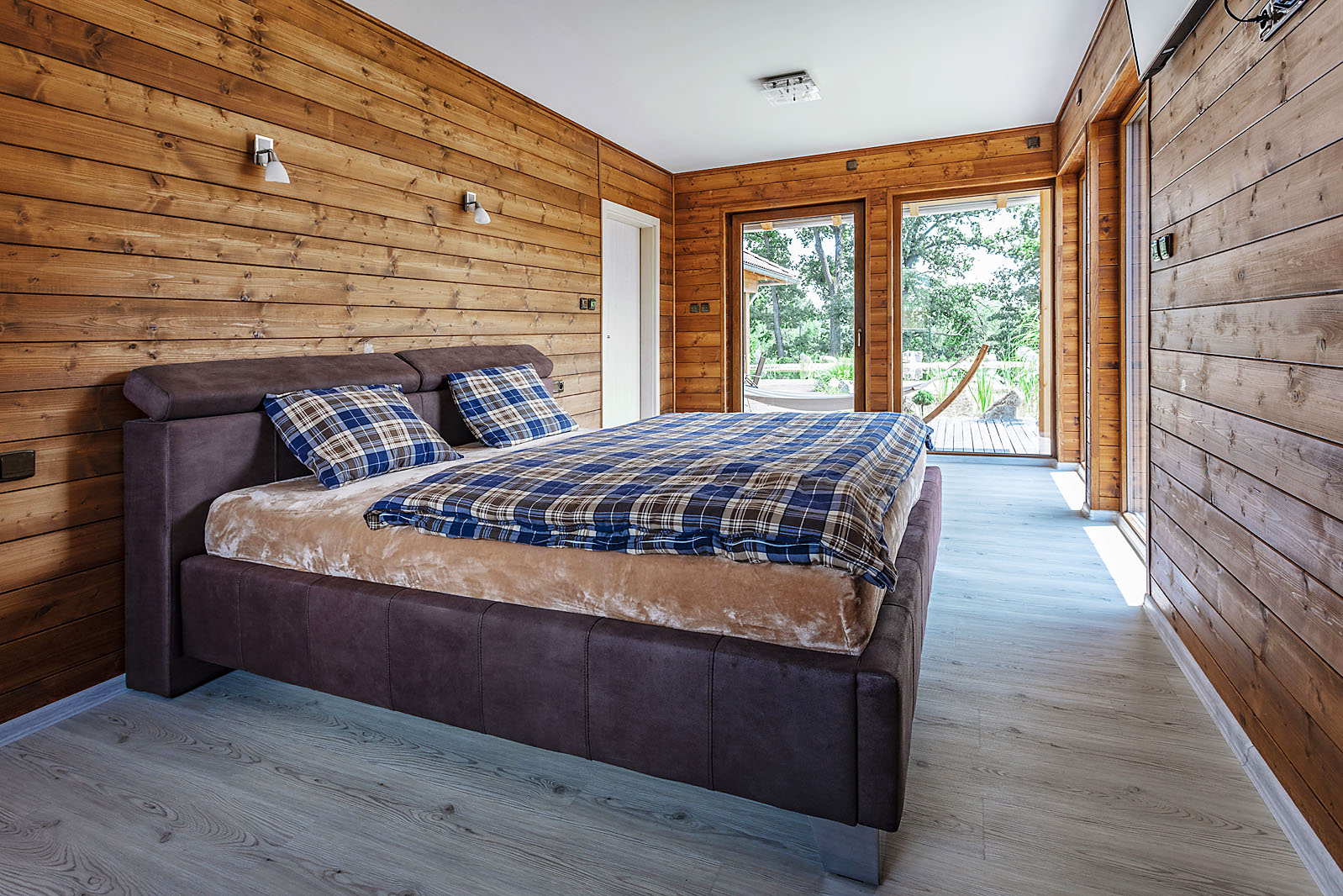 Pohľad z interiéru je vskutku fascinujúci: cez lesknúcu sa hladinu jazierka sa otvára výhľad na slepé rameno rieky a skupinu rybníkov. V sparnom lete možno zo spálne cez terasu skočiť priamo do priezračnej vody jazierka. Posledná miestnosť domu je pracovňa, ktorú možno adaptovať na detskú izbu. Obývacia izba je rovnako ako fasáda obložená kvarcitovým kameňom a smrekovcovým obkladom, a tak exteriér aj interiér spolu opticky komunikujú. V chladných dňoch dodáva priestoru teplo rohový kozub.