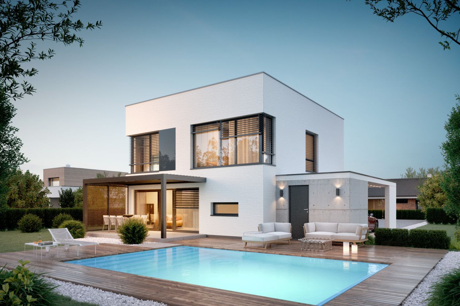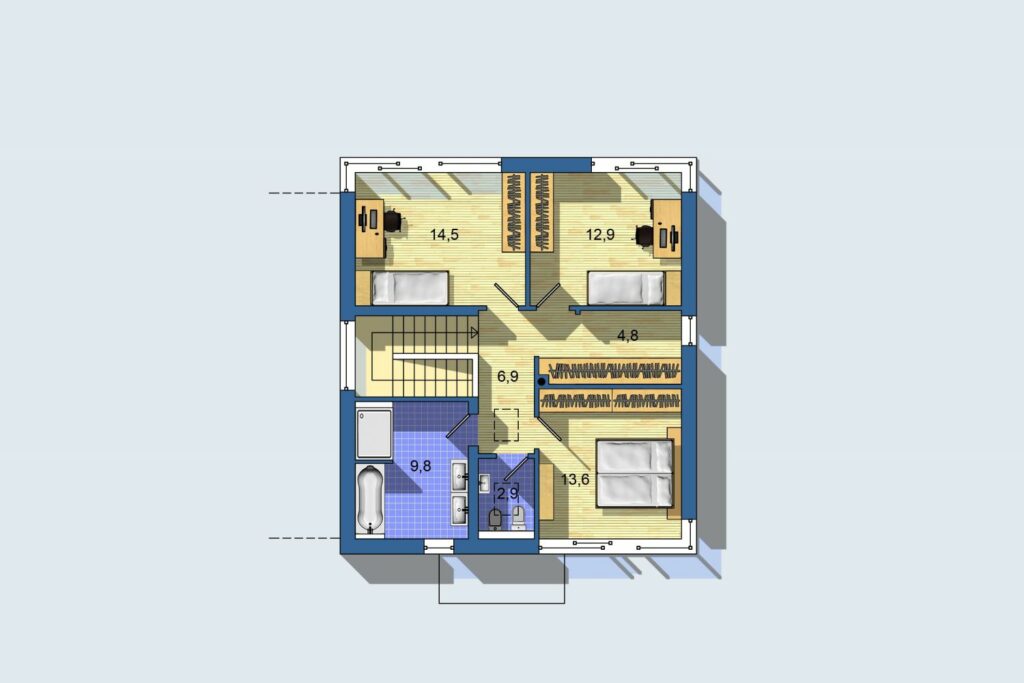 Rodinný dom novej generácie s dôrazom na energetickú úspornosť je vybavený najmodernejšími technológiami – tepelným čerpadlom s chladením, rekuperáciou a inteligentnou elektroinštaláciou. K energetickej úspore prispieva aj účelné rozloženie miestností s krátkymi inštalačnými rozvodmi a kompaktný tvar. Praktický pôdorys s veľkými izbami a dobre využitou dispozíciou s minimálnymi chodbami ušetrí miesto na pozemku. Veľká izba na prízemí môže slúžiť ako pracovňa, spĺňa však nároky aj na spálňu pre dve osoby. Na poschodí obyvatelia ocenia nadštandardne veľkú kúpeľňu a šatník.