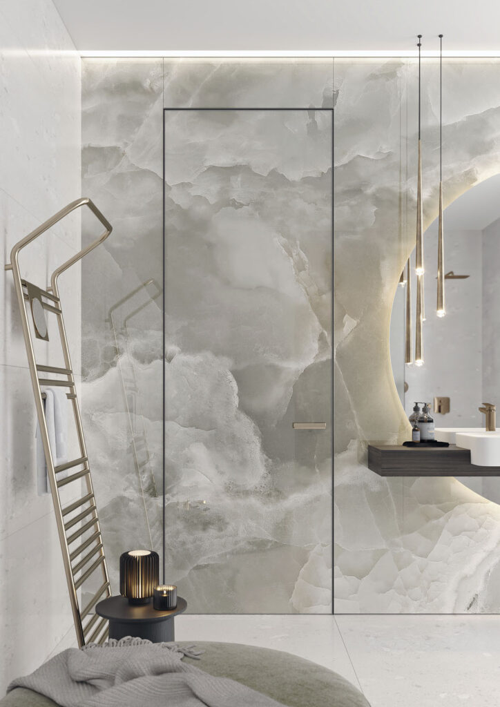 Viete si predstaviť kúpeľňu bez klasických kachličiek? Dnes sú v ponuke aj iné druhy obkladov, napríklad grafosklo či laminovaný povrch v hliníkovom ráme, ktoré plynule nadväzujú na dvere. Tieto riešenia povýšia bežnú kúpeľňu na dizajnový priestor s ľahkou údržbou.