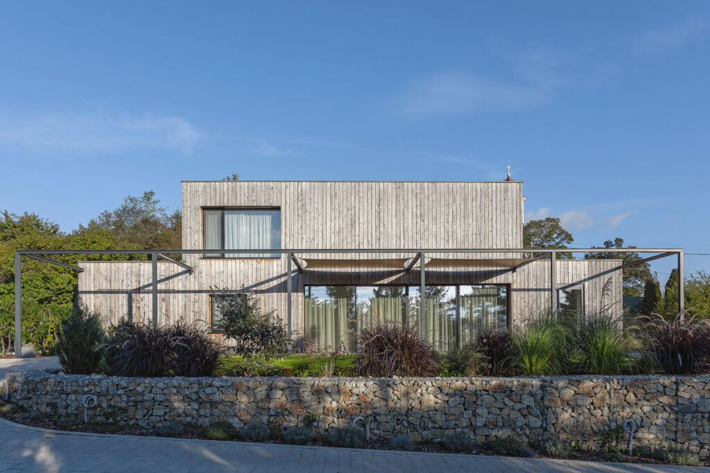 Obklad z neupraveného červeného smreka bude časom starnúť a strácať sa v zeleni. Vertikálna orientácia dosiek opticky skracuje dlhú fasádu