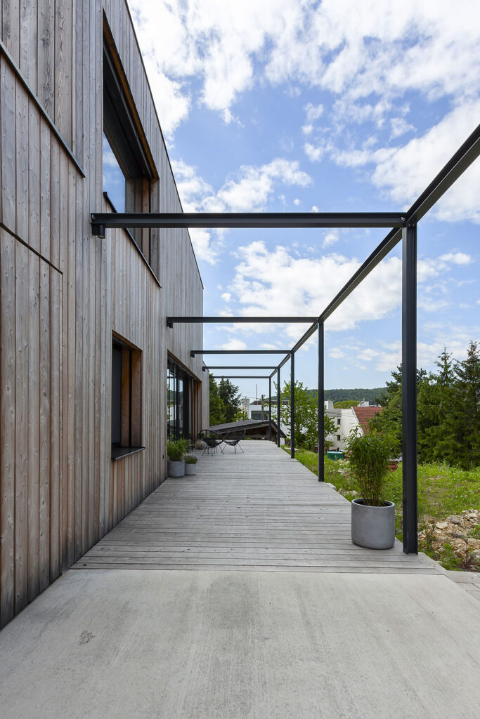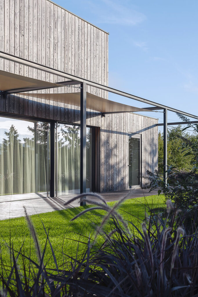 Čierne valcované oceľové profily elegantne kontrastujú s drevenou fasádou. Od jari do jesene nesú tieniace plachty z odolnej textílie