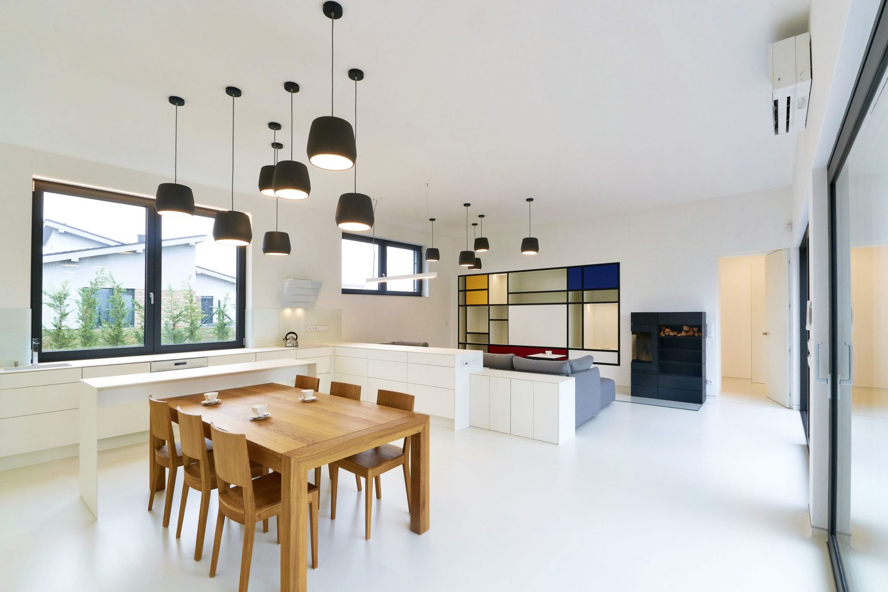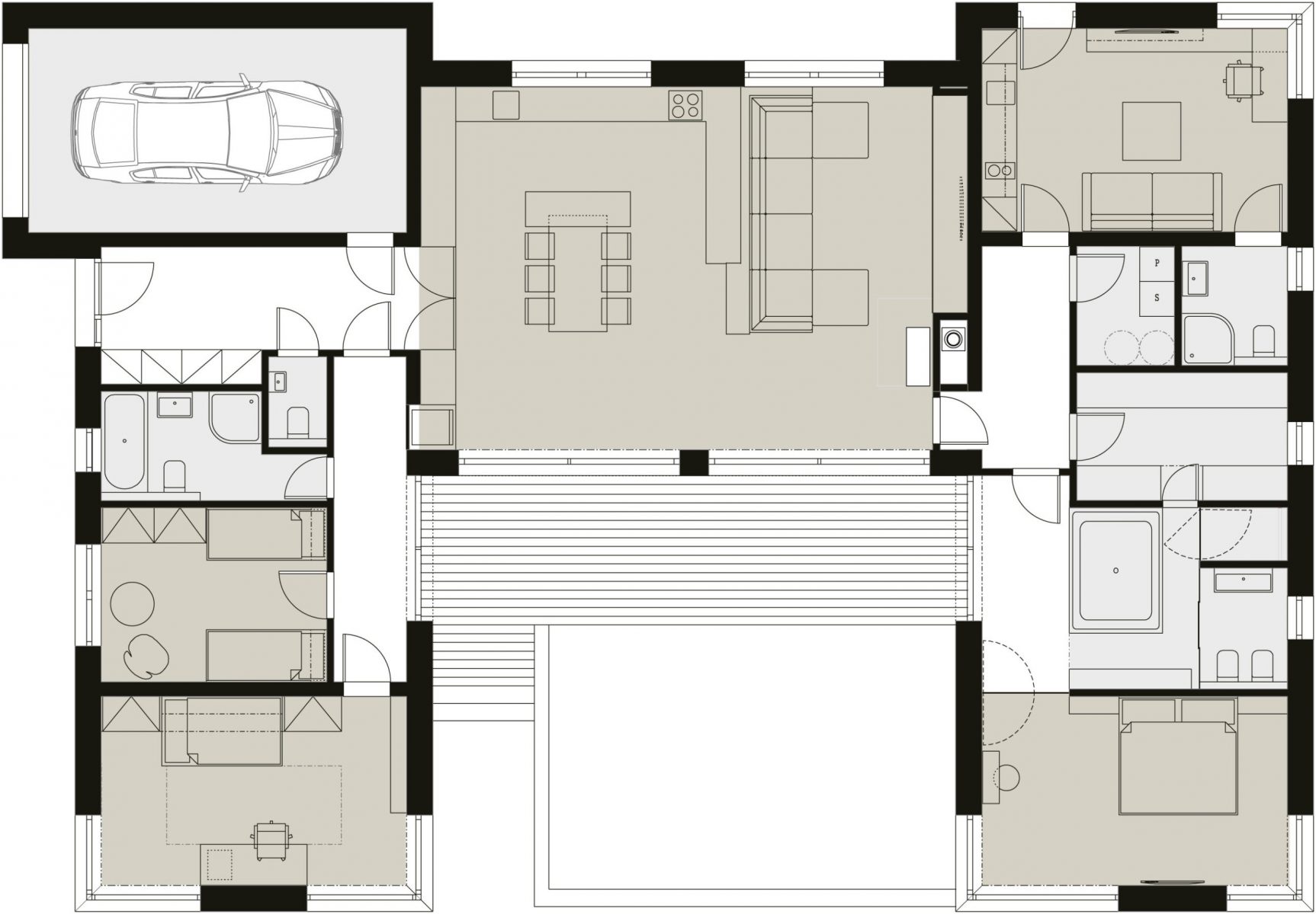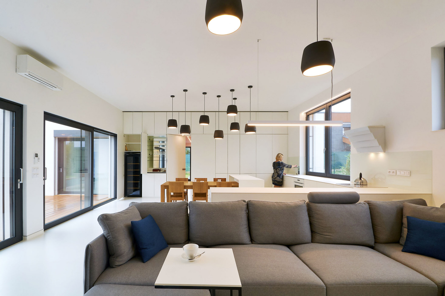 Dispozícia z troch strán obklopuje drevenú terasu s výhľadom na záhradu. V západnom krídle sa okrem zádveria, garáže a WC pre návštevy nachádza samostatná zóna pre deti s dvomi izbami a kúpeľňou. V strednej časti domu je spoločný obývací priestor s kuchyňou, jedálenským stolom a sedením s kozubovými kachľami. Dlhá presklená stena poskytuje výhľad na potok a výstup na terasu.