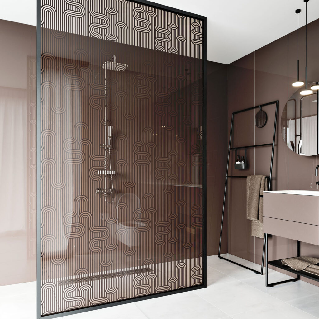 Sklená sprchová stena z tvrdeného skla s grafickým dekórom spája eleganciu a funkčnosť. Je odolná a ľahko sa udržiava