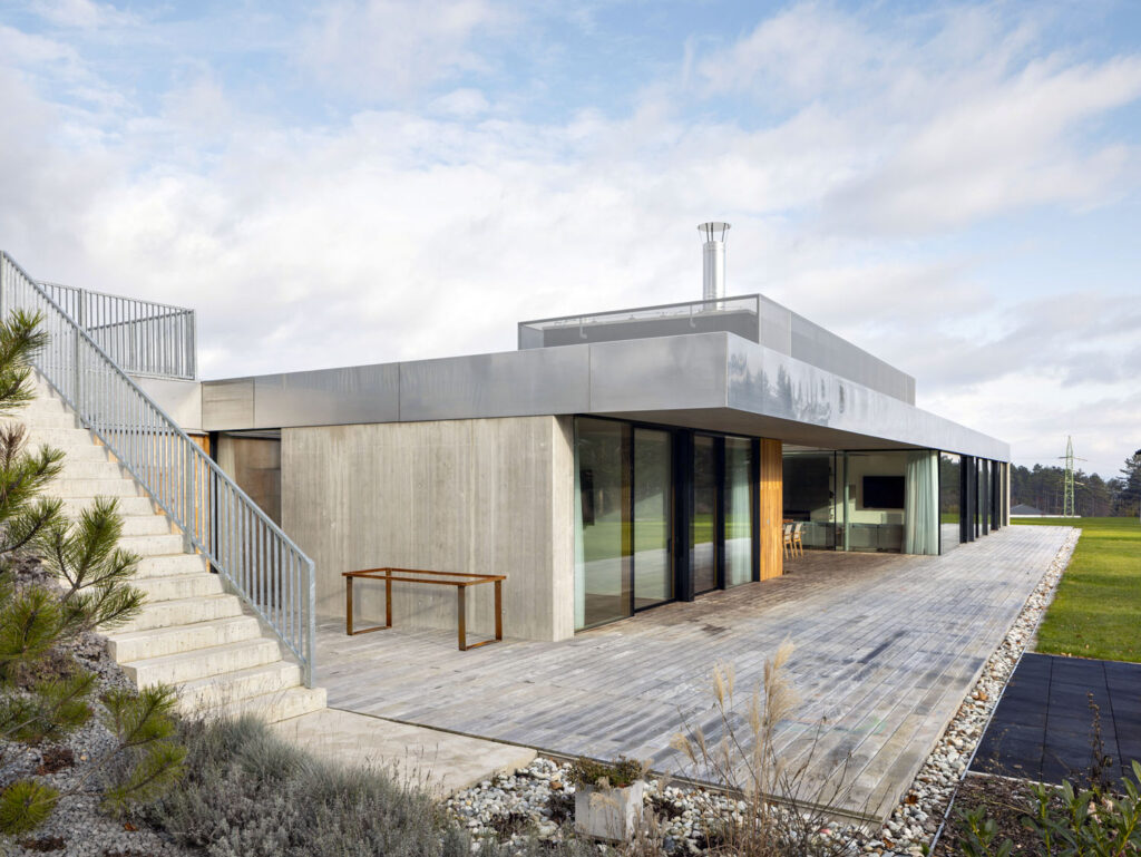 Lokalita zvaná Suchý vrch leží na kopci nad Banskou Bystricou na úpätí Kremnických vrchov. Majitelia domu aj architekti dokonale pochopili jedinečný a nenahraditeľný potenciál tohto miesta – krásna príroda v okolí a výhľady na mesto, borovicové lesy priamo za plotom a na obzore silueta hrebeňov Veľkej Fatry a Nízkych Tatier. Táto jedinečná konfigurácia si vyžiadala špeciálny prístup. „Zadaním bol jednopodlažný dom v maximálnom kontakte so záhradou, výhľady na les zo všetkých obytných miestností, zachovanie súkromia,“ uvádza architekt Martin Paulíny, spoluautor návrhu. „Klienti si priali dobre presvetlený, ale aj účinne tienený interiér prepojený s obytnou terasou. Po praktickej stránke odolný dom s minimálnymi nárokmi na údržbu. Od tejto požiadavky sa odvíjala skladba materiálov – jednoduchá, surová, bez vrstvených povrchov a zložitých detailov.“ Základom je monolitická betónová sendvičová konštrukcia s nosnou železobetónovou časťou, vloženou tepelnou izoláciou z fenolovej peny a pohľadovým betónom na povrchu. Konštrukcia zvýšenej strechy a vnútorné stĺpiky sú z ocele, trojuholník elementárnych materiálov dopĺňa prírodné drevo na podlahách, interiérových a exteriérových obkladoch, dverách a oknách.