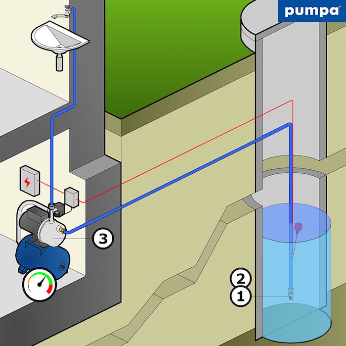 Na čerpanie vody zo studne z hĺbky do 8m môžete použiť kompletnú domácu vodáreň. V samotnej studni je umiestnený sací kôš so spätnou klapkou (1,2) a prípadne aj ochrana pred suchobehom. Domáca vodáreň je zložená z čerpadla (3), tlakovej nádoby s manometrom a tlakovým spínačom nainštalovaným na tzv. päťcestnej armatúre. Pri poklese tlaku v sústave (napr. otvorením kohútika) pod nastavený zapínací tlak tlakový spínač automaticky zapne čerpadlo a vypne ho pri dosiahnutí nastaveného vypínacieho tlaku. Pri nedostatku vody a v prípade, že máte v studni nainštalovanú ochranu pred suchobehom, spínacie zariadenie čerpadlo vypne a ochráni ho pred poškodením. Spínacie zariadenie ochrany pred suchobehom nedovolí čerpadlo zapnúť skôr, ako je dosiahnuté dostatočné množstvo vody v studni. Ako ochranu pred suchobehom môžete použiť ponorné sondy alebo plavákový spínač. Pre bezproblémovú funkciu systému je vždy nutné dodržať správne nastavenie tlaku vzduchu v expanznej nádobe, ktorý má byť o 0,2 baru nižší, než zapínací (spodný) tlak na tlakovom spínači. Tento tlak je nutné nastaviť v suchom stave nádoby, teda pred vlastnou montážou do systému.