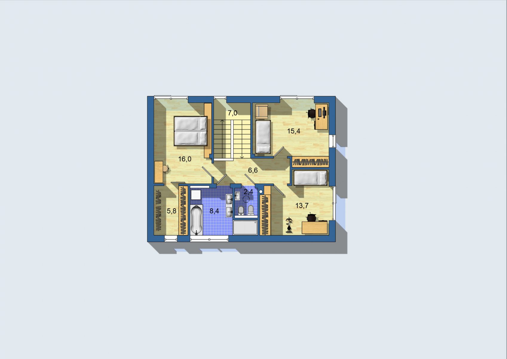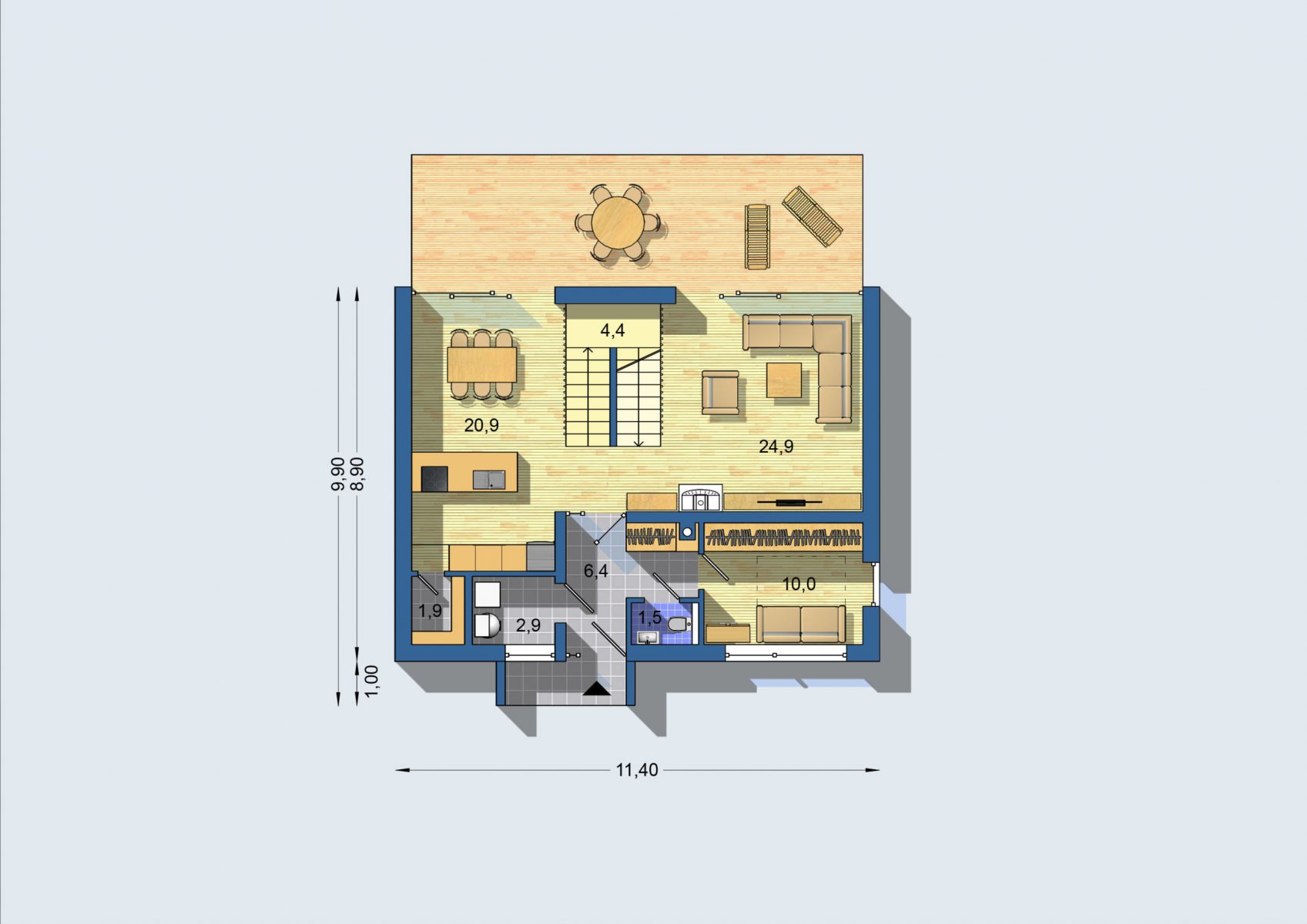 Hlavný obytný priestor na prízemí je navrhnutý ako veľkopriestor, opticky rozdelený centrálne umiestneným pohodlným schodiskom. Výrazným prvkom dispozície je samostatná jedáleň s veľkou zasklenou stenou orientovanou na terasu. Praktická menšia izba pri vchode môže slúžiť ako pracovňa. Poschodie je plnohodnotné, s plnou výškou a tromi priestrannými izbami. Komfort zvyšuje veľký šatník, nadštandardná kúpeľňa a samostatné WC.