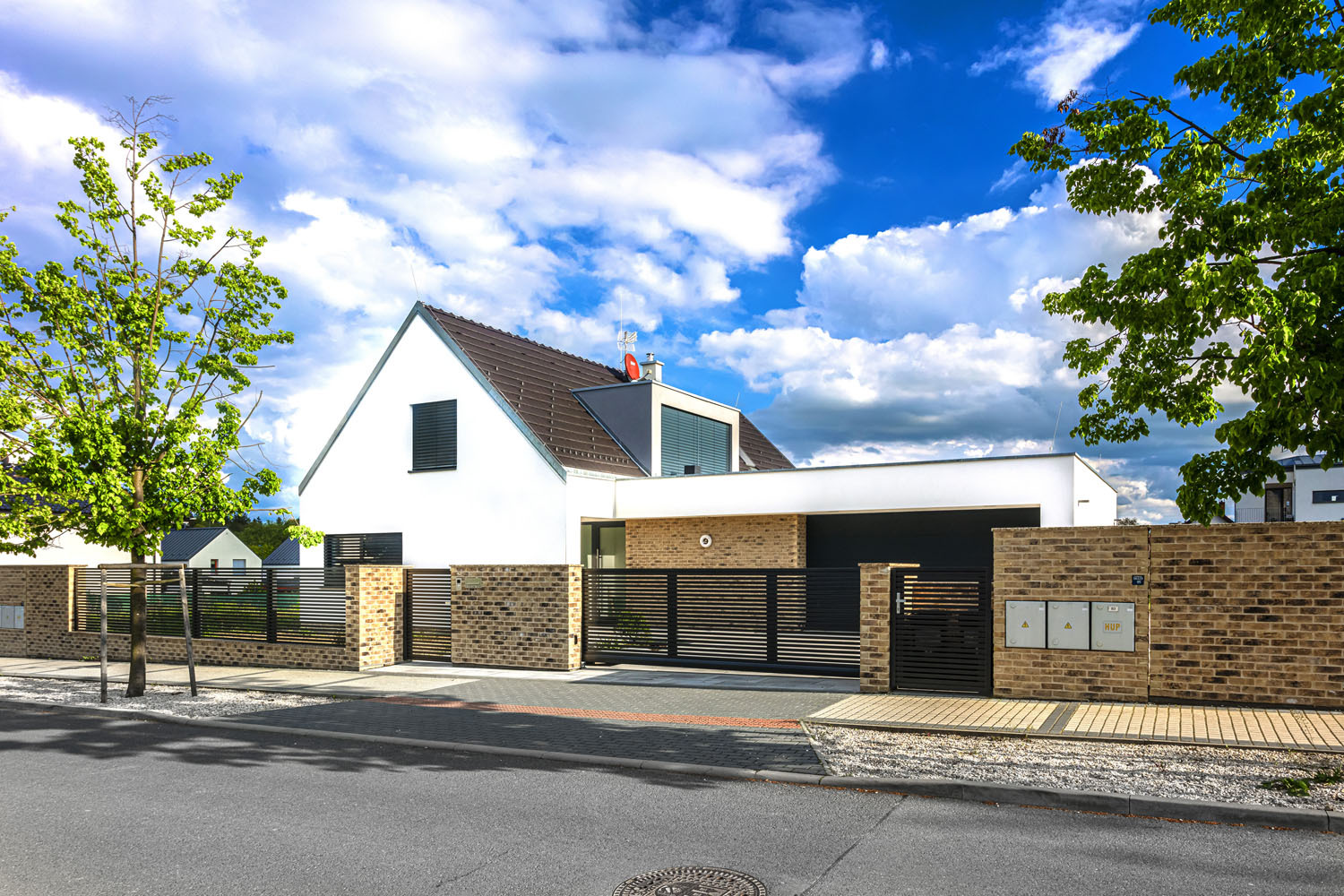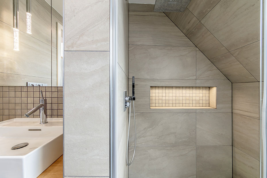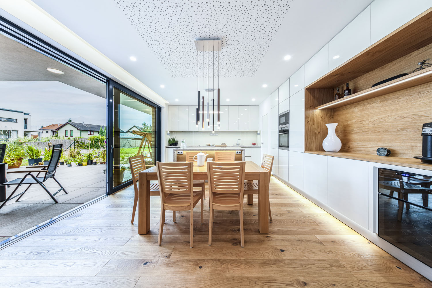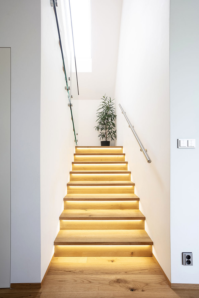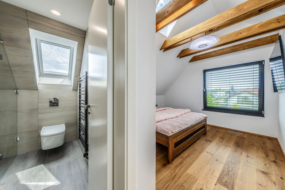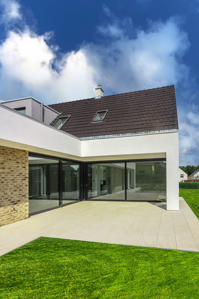 Prvý vzorový dom postavený v programe Wienerberger e4 dom je ukážkou koncepčných, stavebných i architektonických možností projektu, ktorého hlavnou ambíciou je vytvoriť dom, ktorý je nielen úsporný, ale aj primerane ekonomicky náročný tak na obstaranie, ako aj na prevádzku. V prízemí sa nachádza spoločenská časť domu s obývacou izbou a kuchyňou s väzbou na priestrannú terasu, potom hosťovská izba a ďalšie zázemie – dvojgaráž a úložné priestory. Do podkrovia sú situované dve detské izby, kúpeľňa s východom na terasu a spálňa s vlastnou šatňou a kúpeľňou. Dom má celokeramickú obálku z tehlového muriva Porotherm, pálenej strešnej krytiny Tondach vrátane systému izolácie iRoof. Je postavený podľa štandardov domu s takmer nulovou spotrebou energie a navrhnutý primárne pre mladé rodiny s jedným a viac deťmi tak, aby fungoval v každej životnej etape rodiny. Dom má podlahové teplovodné vykurovanie a chladenie Pipe-Life, ako zdroj energie používa vzduchové tepelné čerpadlo Stiebel Eltron, krb s krbovou vložkou a nechýba inteligentné riadenie domácnosti ABB Free Home.