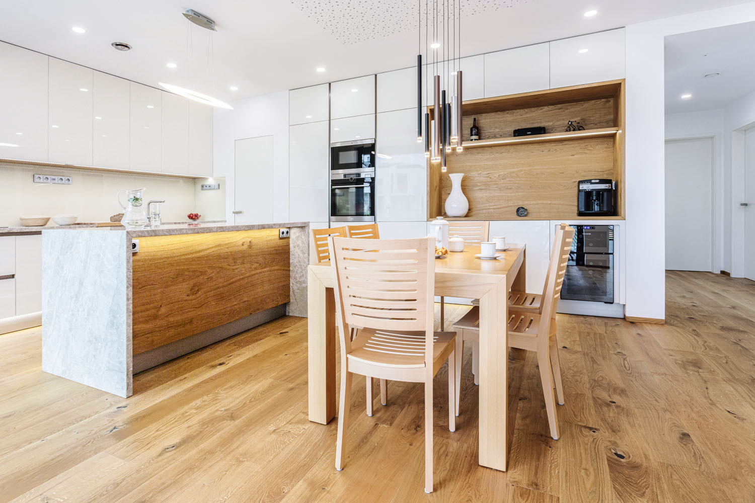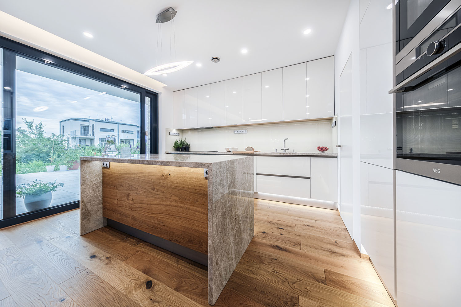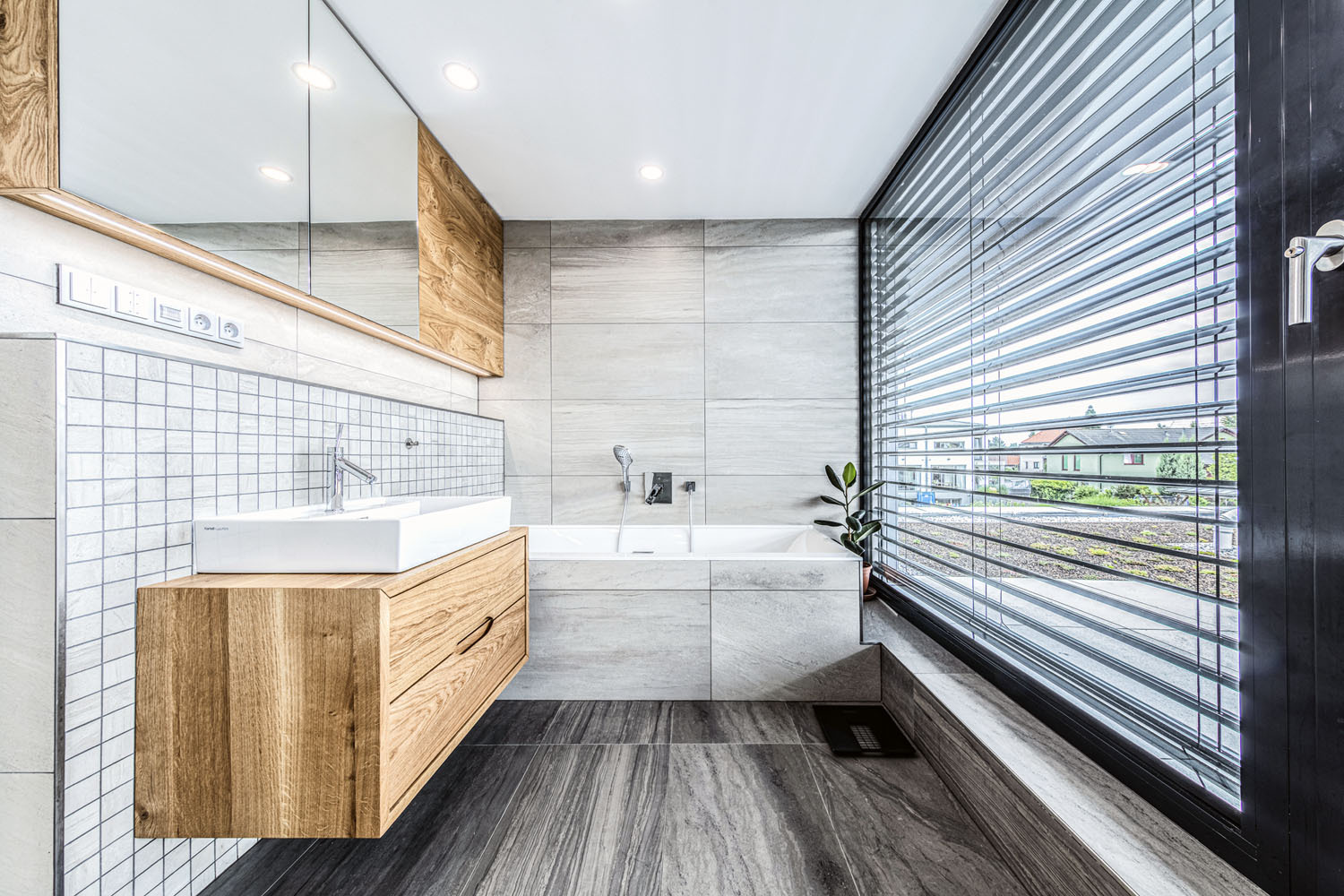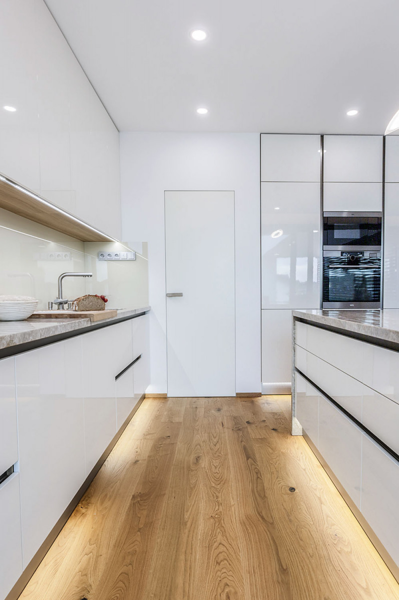 Prvý vzorový dom postavený v programe Wienerberger e4 dom je ukážkou koncepčných, stavebných i architektonických možností projektu, ktorého hlavnou ambíciou je vytvoriť dom, ktorý je nielen úsporný, ale aj primerane ekonomicky náročný tak na obstaranie, ako aj na prevádzku. V prízemí sa nachádza spoločenská časť domu s obývacou izbou a kuchyňou s väzbou na priestrannú terasu, potom hosťovská izba a ďalšie zázemie – dvojgaráž a úložné priestory. Do podkrovia sú situované dve detské izby, kúpeľňa s východom na terasu a spálňa s vlastnou šatňou a kúpeľňou. Dom má celokeramickú obálku z tehlového muriva Porotherm, pálenej strešnej krytiny Tondach vrátane systému izolácie iRoof. Je postavený podľa štandardov domu s takmer nulovou spotrebou energie a navrhnutý primárne pre mladé rodiny s jedným a viac deťmi tak, aby fungoval v každej životnej etape rodiny. Dom má podlahové teplovodné vykurovanie a chladenie Pipe-Life, ako zdroj energie používa vzduchové tepelné čerpadlo Stiebel Eltron, krb s krbovou vložkou a nechýba inteligentné riadenie domácnosti ABB Free Home.