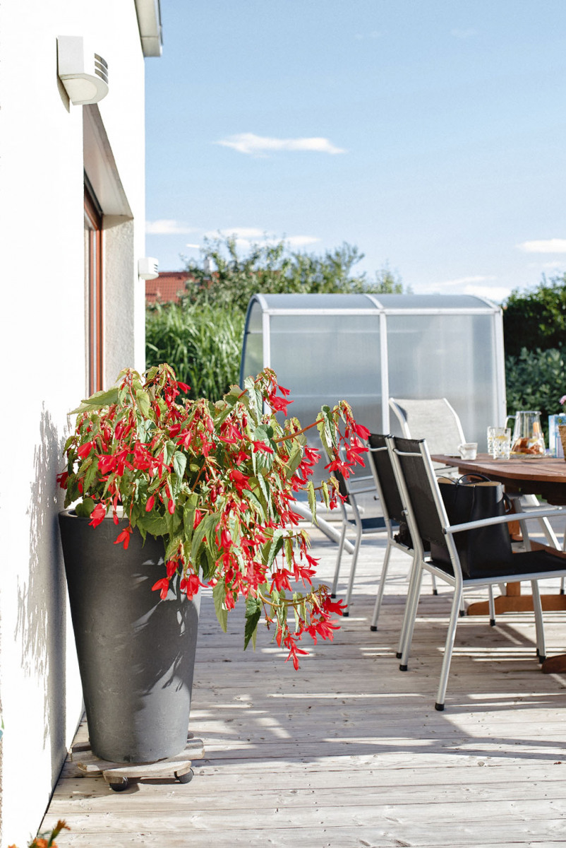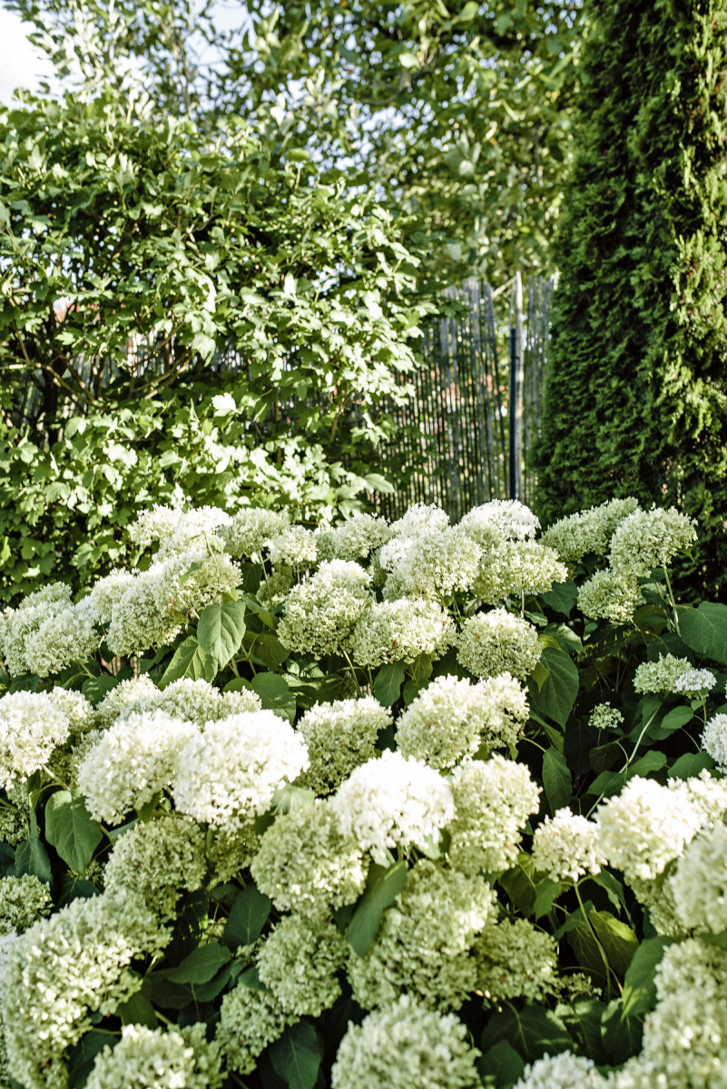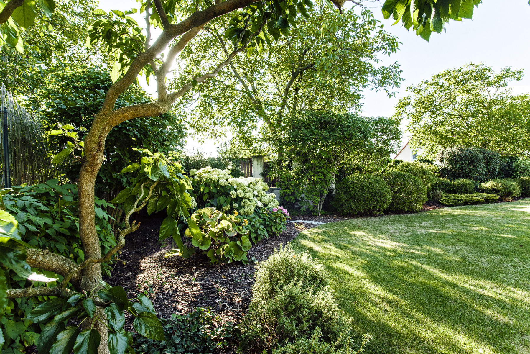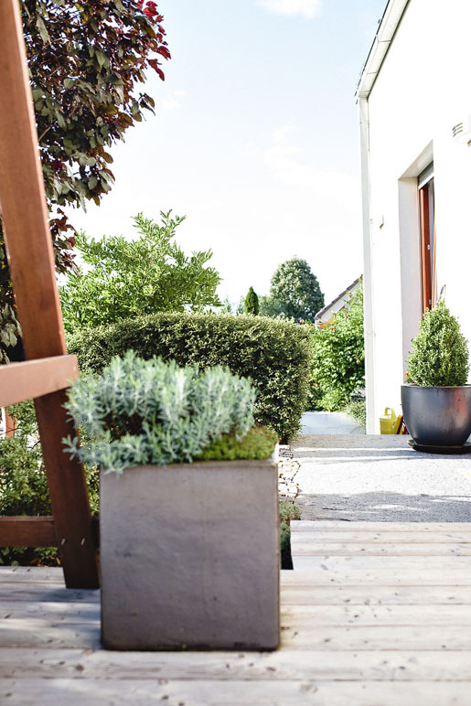 Úpravy terénu záhrady prebiehali spoločne s potrebami stavebníkov, zemina a kamene sa využili predovšetkým na cesty a spevnené plochy pre príjazd do garáže, ktorá sa nachádza pod úrovňou terénu, pod obytným podlažím. Dom i záhradu vytvorili v minimalistickom štýle, obývaciu časť prepája so záhradou veľké francúzske okno, za ktorým je drevená terasa so štýlovým nábytkom. Tu sa griluje, stoluje, odpočíva a slní. Terasa je priamo prepojená so zastrešeným bazénom a tvoria akýsi vestibul záhrady, predĺženú obývaciu plochu.