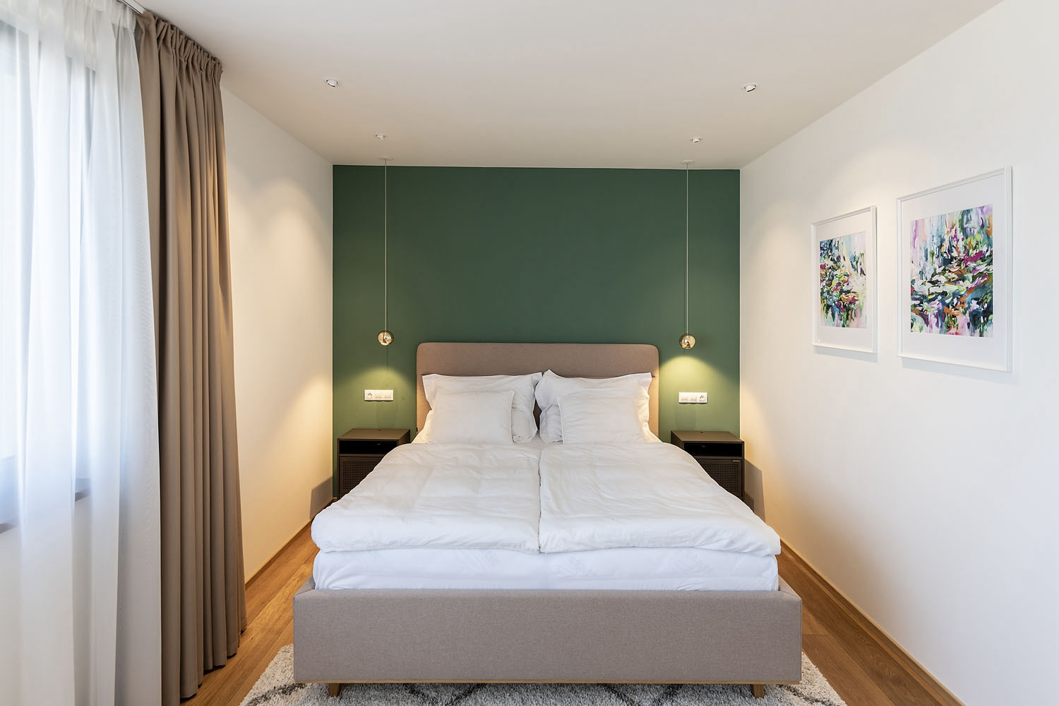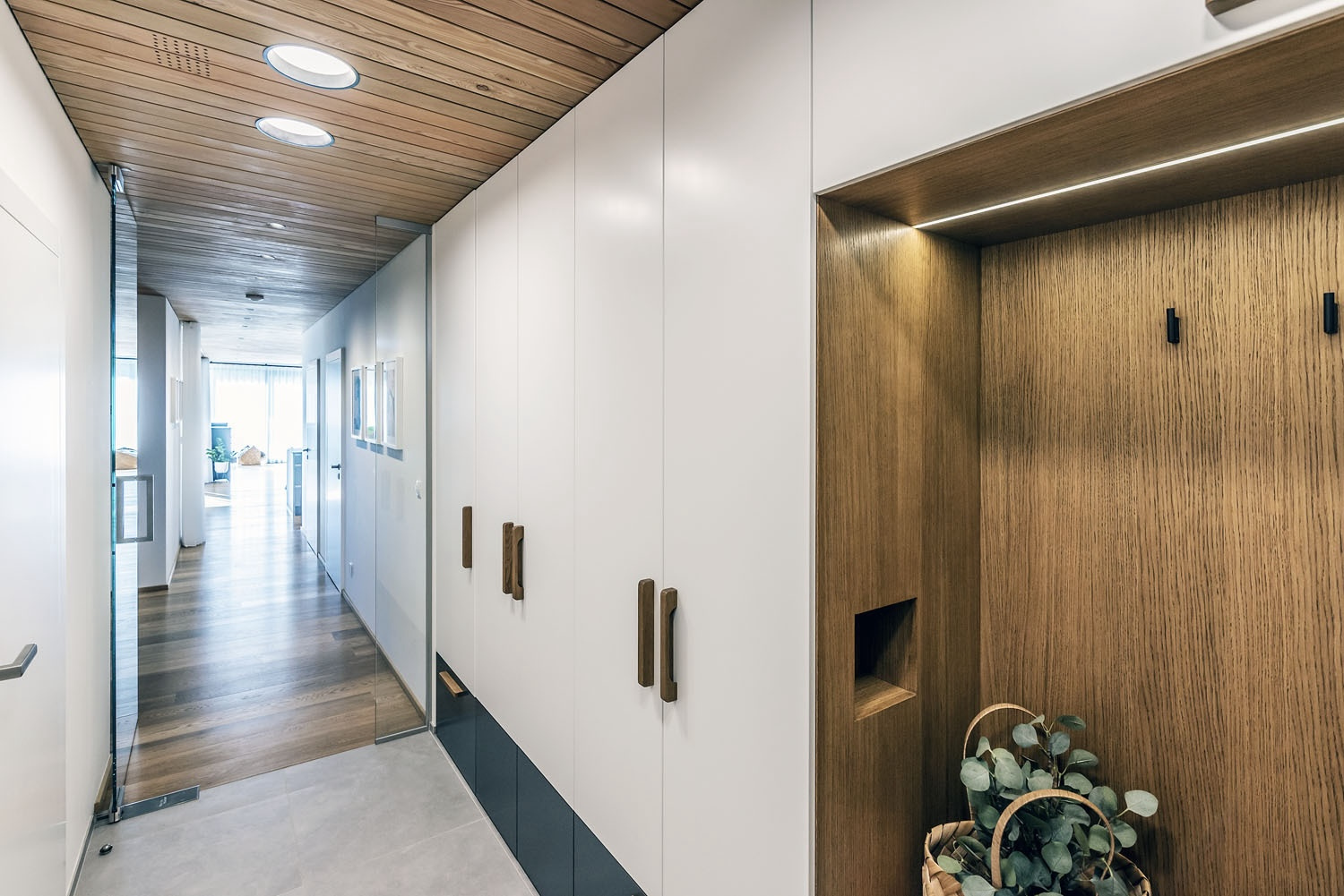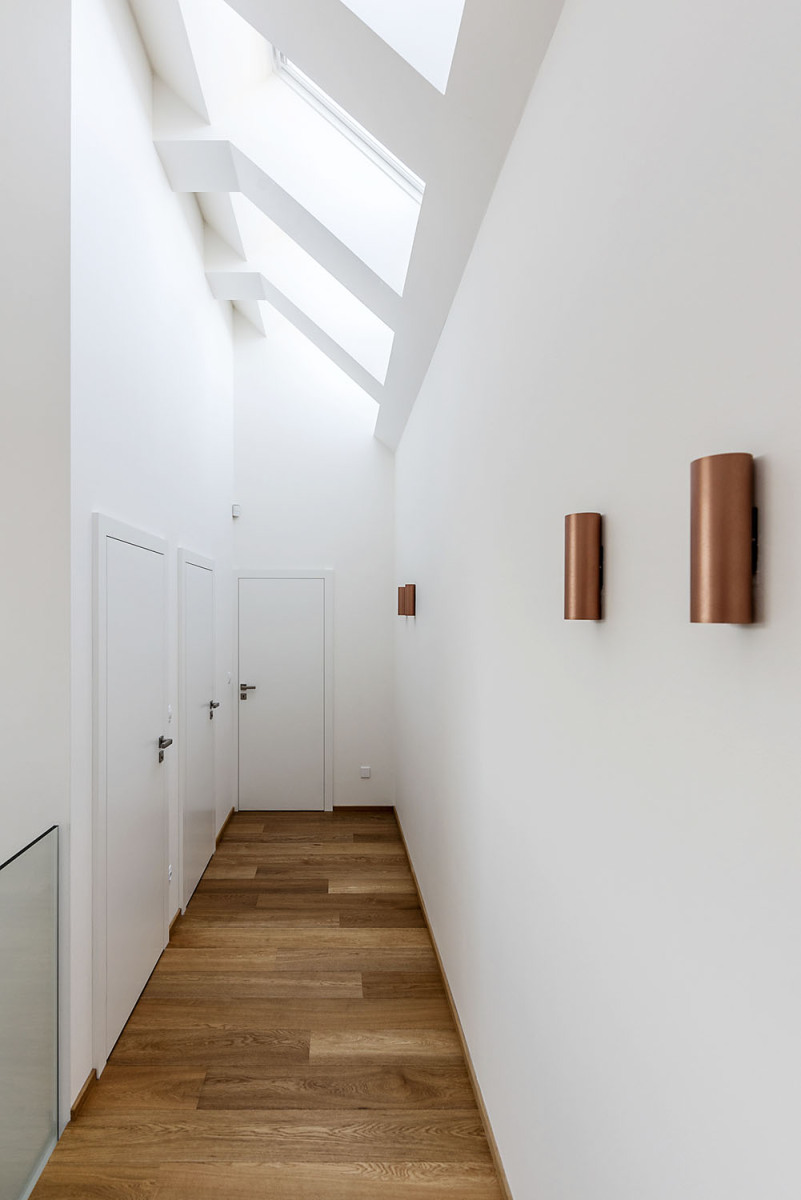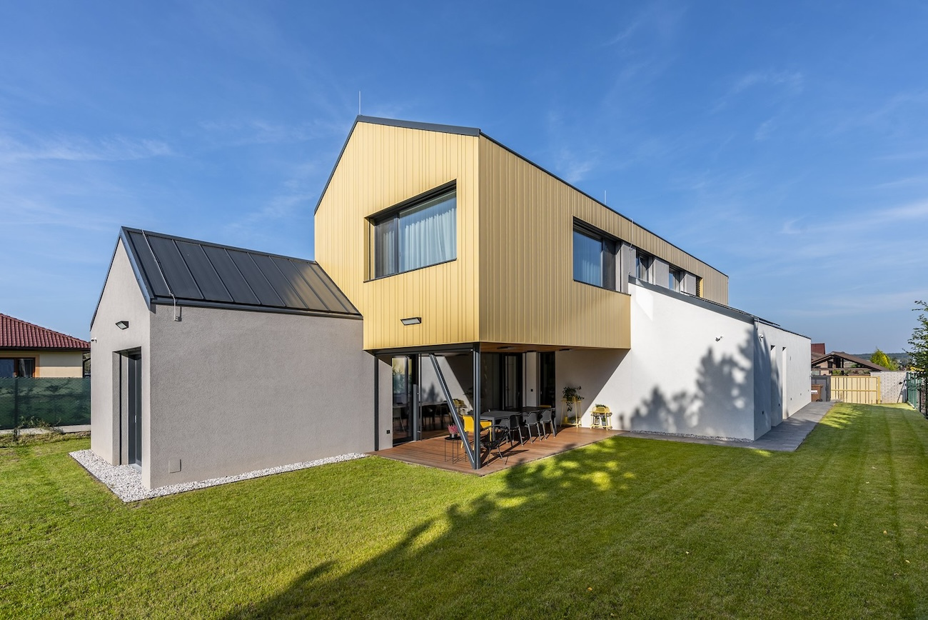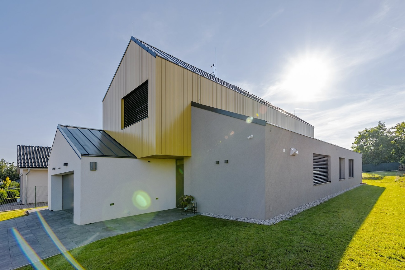 a pojednaním fasády. Tá najdlhšia z nich zahŕňa vstup do domu so šatňou, pracovňou, špajzou a ústrednou pozdĺžnou komunikáciou, ktorá smeruje do spoločného obývacieho priestoru orientovaného do zadnej časti pozemku. Navonok má sivú omietku a tesne susedí s útvarom, v ktorom sa nachádza dvojgaráž, schodisko a hosťovská izba s kúpeľňou, prístupnou aj zvonku z terasy. „Garážový“ trakt zvonku pokrýva biela omietka. Na týchto dvoch hmotách spočíva horná spálňová časť, rozdelená na zónu rodičov a dve detské izby so zázemím. Má vetranú fasádu obloženú žltými šablónami z hliníkového plechu a svojím veľkorysým presahom zastrešuje terasu pri obývacej izbe. Prienik hmôt sa prejavuje aj v interiéri, kde horné podlažie zasahuje do zvýšeného stropu nad obývacou izbou. Architekti moderným a originálnym spôsobom spracovali archetyp vidieckeho domu a prirodzene ho zakomponovali do prostredia malej obce.