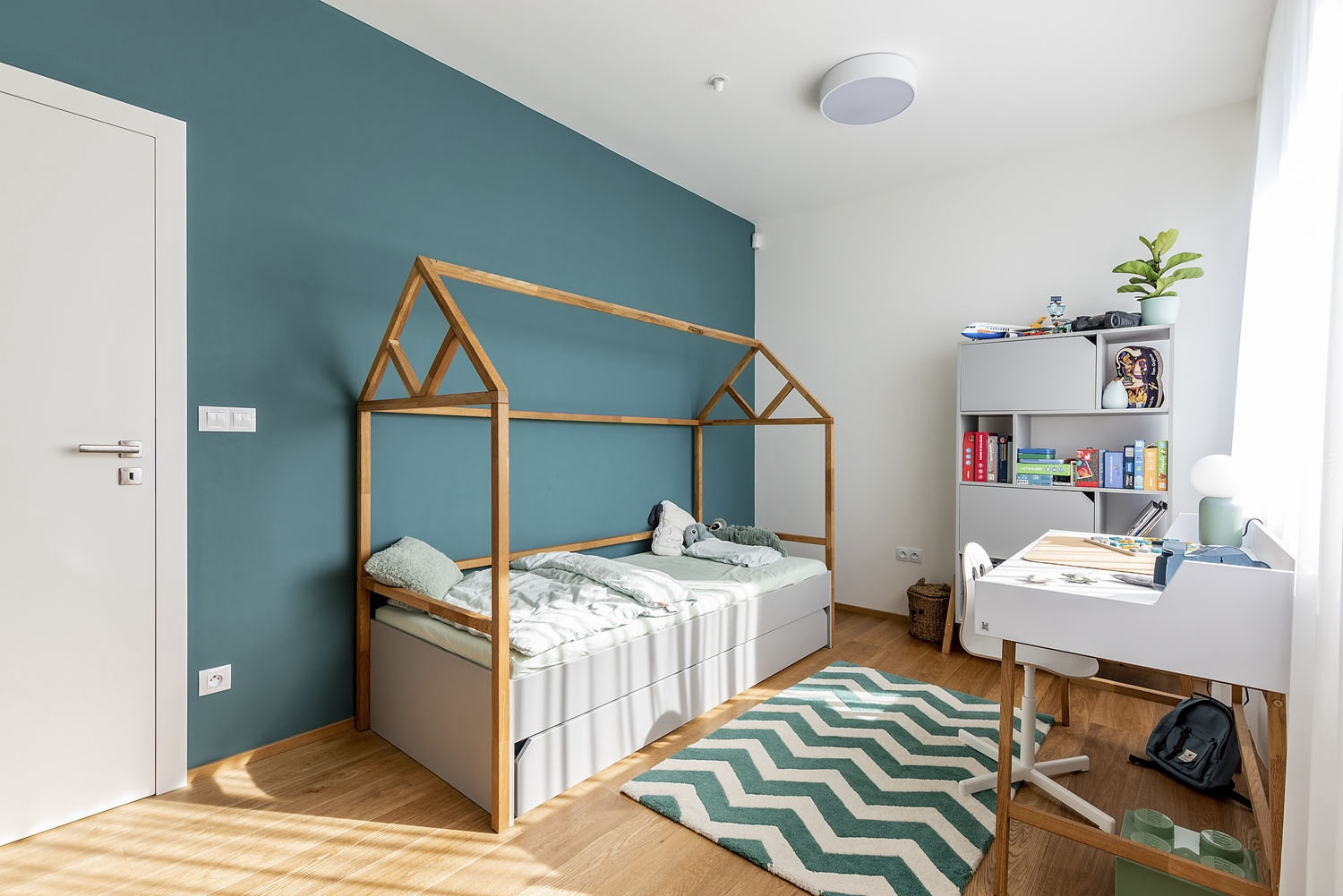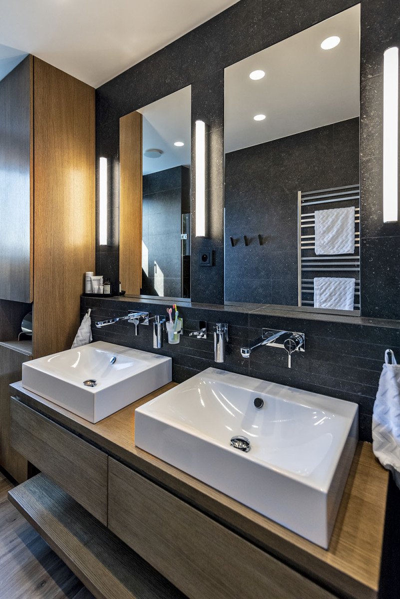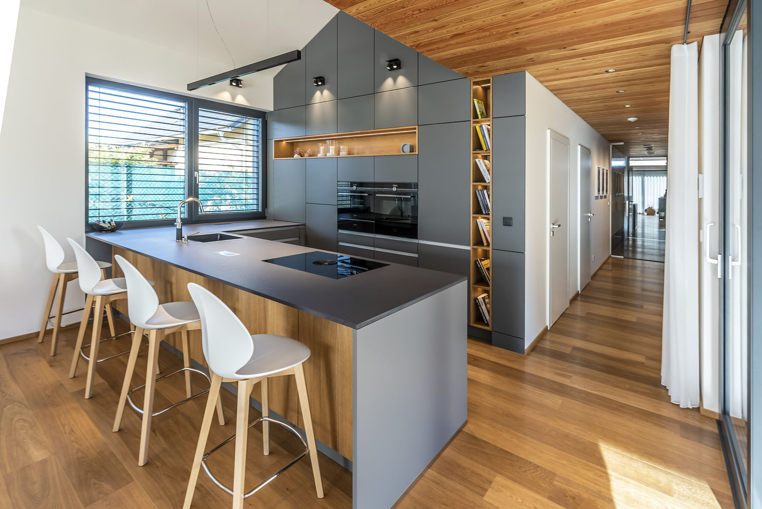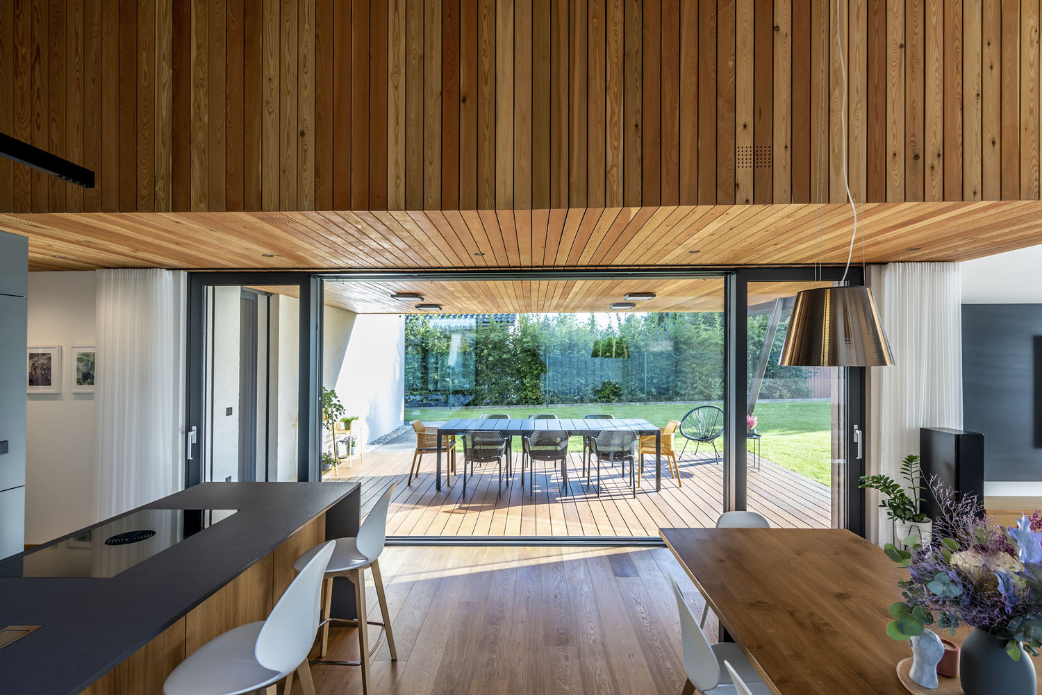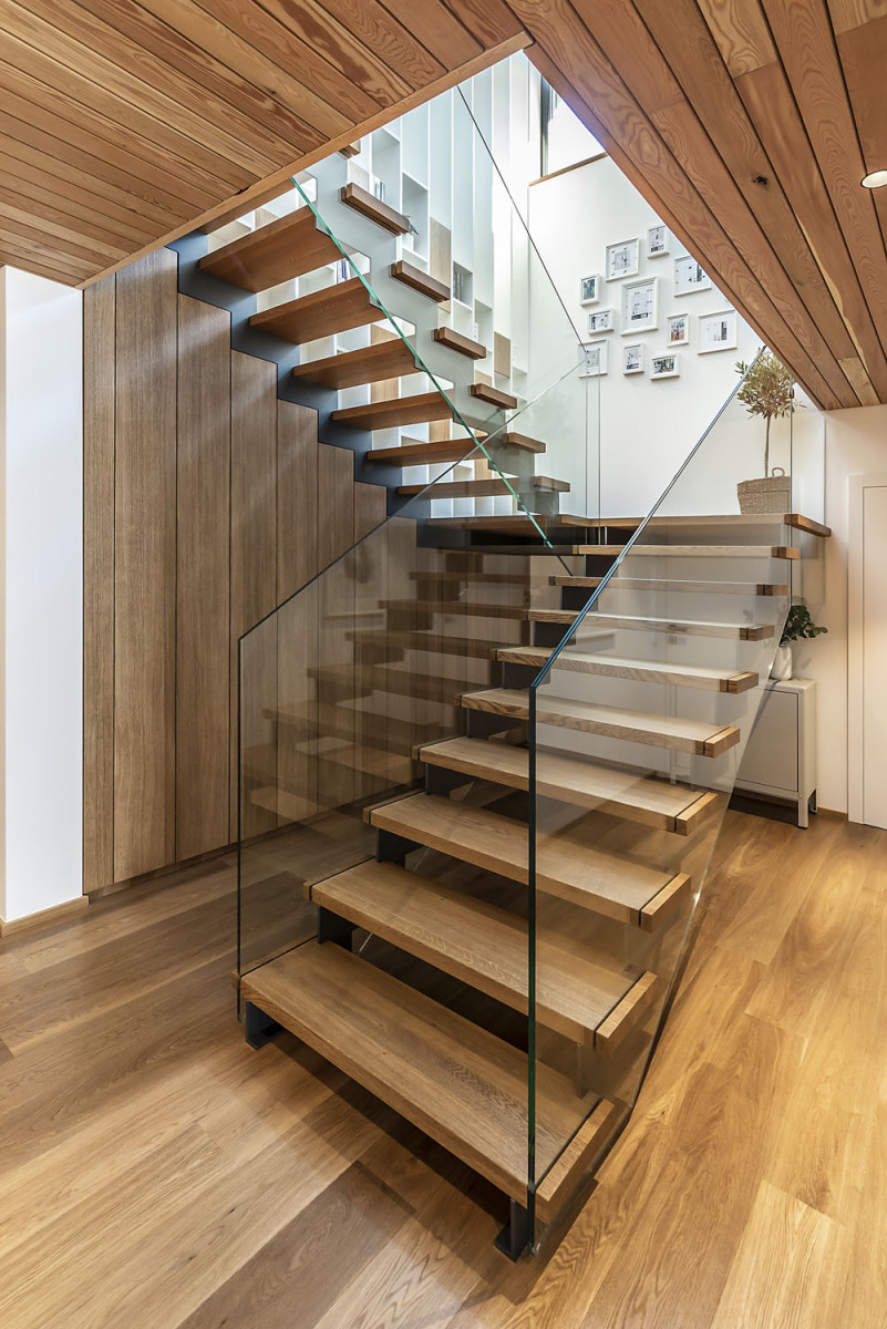 Tri rôzne veľké hmoty s asymetrickými sedlovými strechami sú vzájomne posunuté, ich presahy dodávajú domu členitosť a plnia rôzne funkcie. Každá hmota je navonok odlíšená trochu iným tvarom strechy