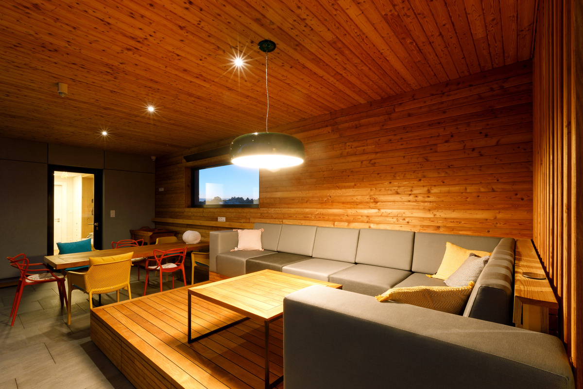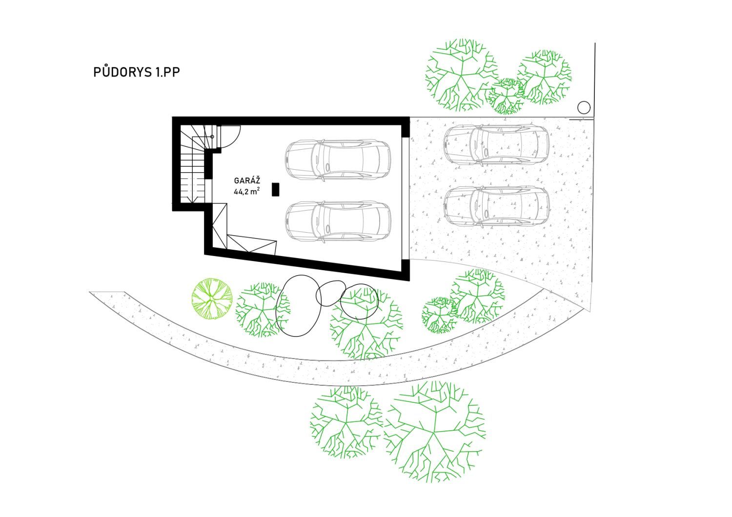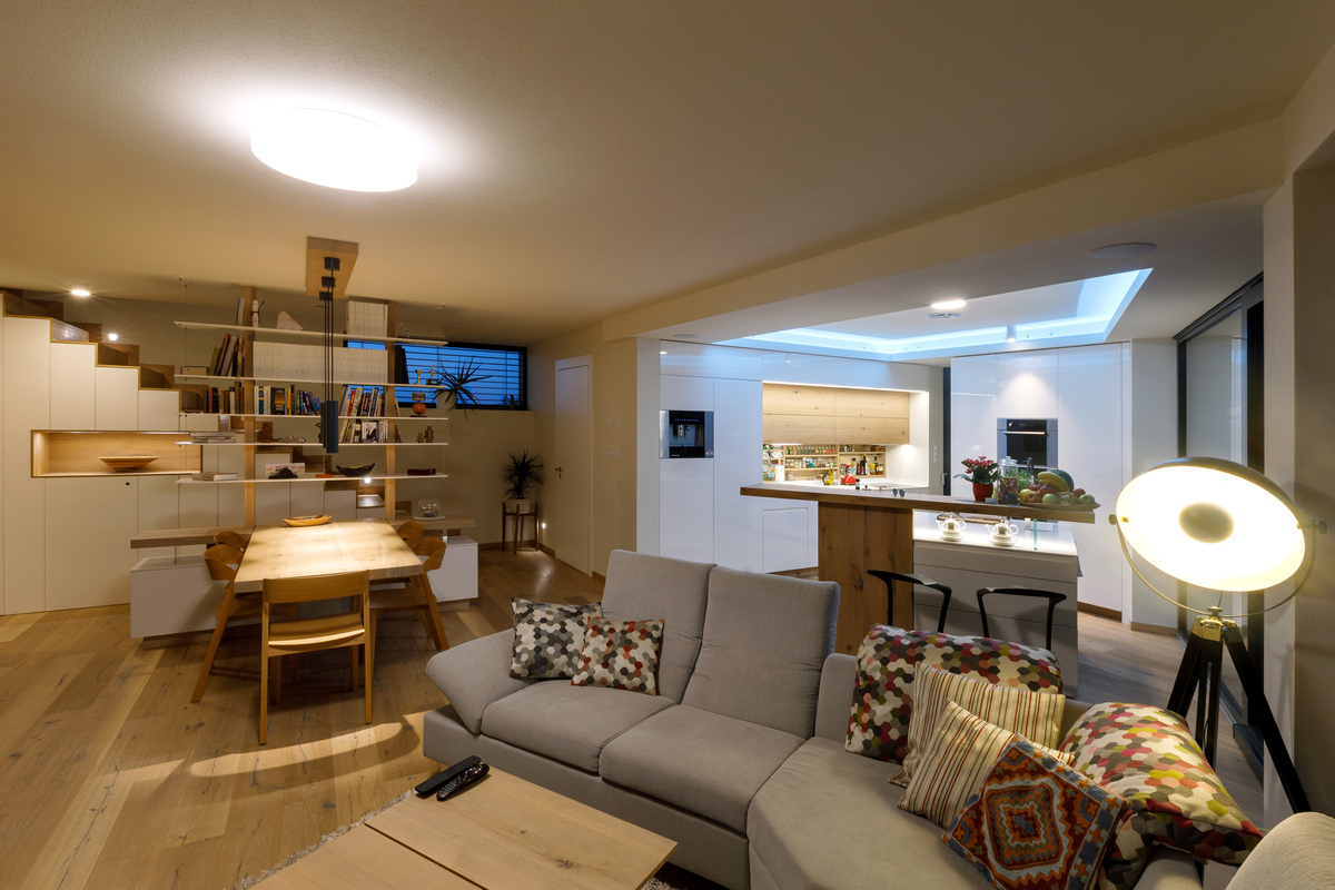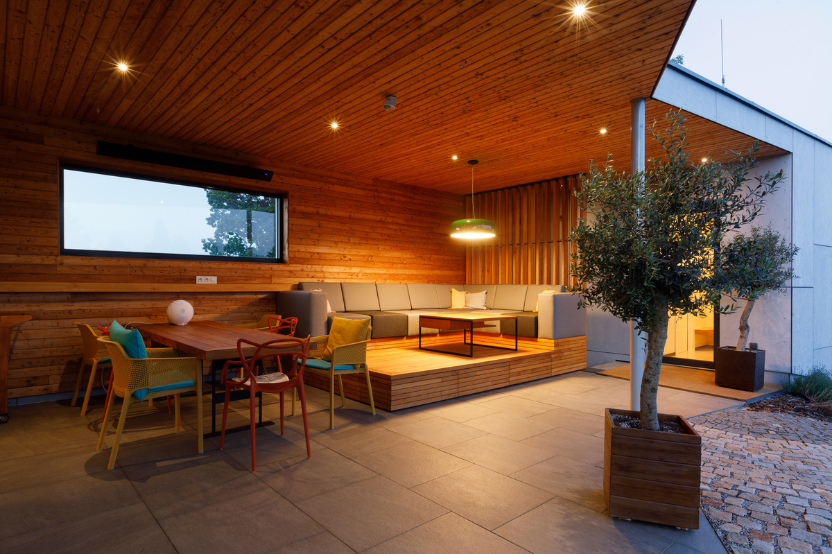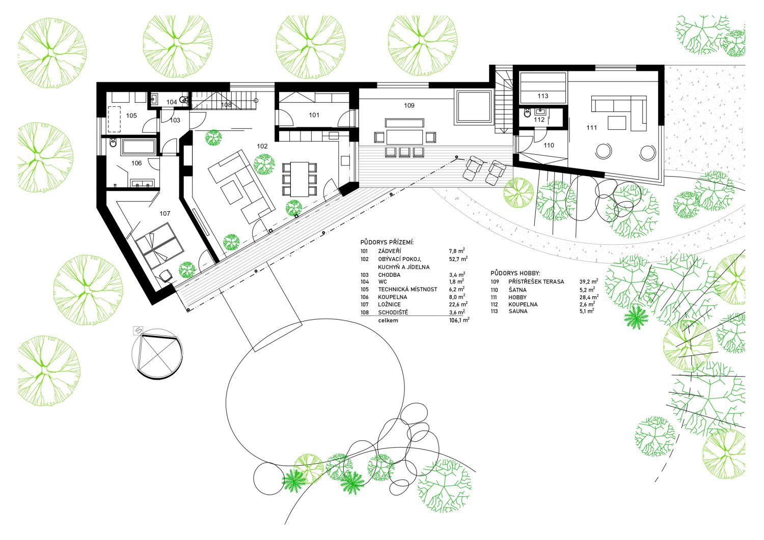 Úžitková plocha: rodinná časť 132 m2, spoločenská časť 61 m2, garáž 61 m2, zastrešená terasa 38 m2