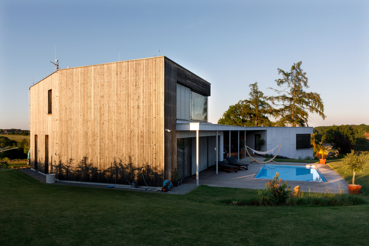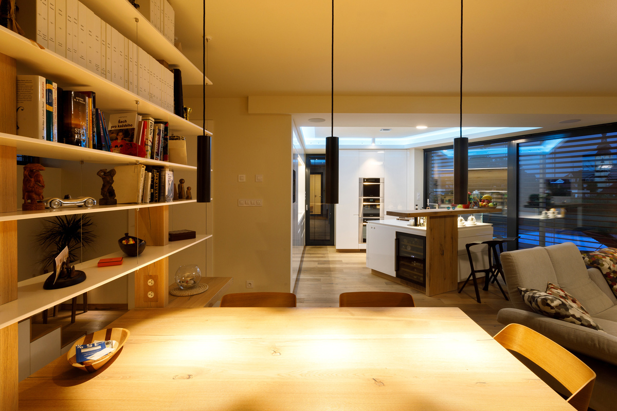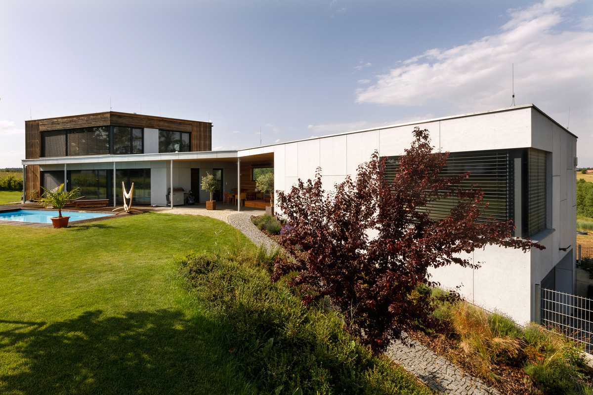 Nízkoenergetický dom (prešiel Blower door testom a získal zelenú dotáciu) s dokonalou dispozíciou a nadväznosťou na záhradu poskytuje krásne výhľady a originálnym tvarom skráteného ihlanu harmonizuje s atypickým pozemkom. Tehlová stavba s odvetrávanou fasádou obloženou smrekovcovými latami a fasádnymi doskami zaujme veľkými zasklenými plochami. Dom je rozdelený na dve časti prepojené terasou. Na obvodové steny s fasádnym obkladom boli použité tehly HELUZ FAMILY 25 a hliníkové okenné systémy s trojitým izolačným sklom Schüco. Podzemné podlažie je murované zo šalovacích vybetónovaných tvárnic, strop je železobetónový. Strecha je realizovaná z drevených KVH nosníkov, zateplená fúkanou izoláciou. Dom je vykurovaný tepelným čerpadlom s vrtom a podlahovým vykurovaním. Rekuperácia zlepšuje vnútornú mikroklímu a klimatizáciu v dome nahradzuje podlahové chladenie. Nainštalovaná bola inteligentná elektroinštalácia, vďaka ktorej sú ovládané žalúzie, osvetlenie, kúrenie aj zabezpečenie domu i hudba, ktorá sa šíri domom a navodzuje priateľskú atmosféru.