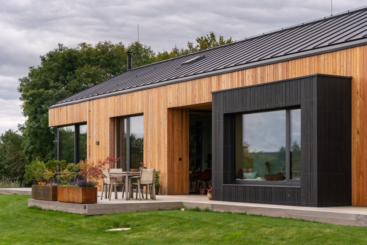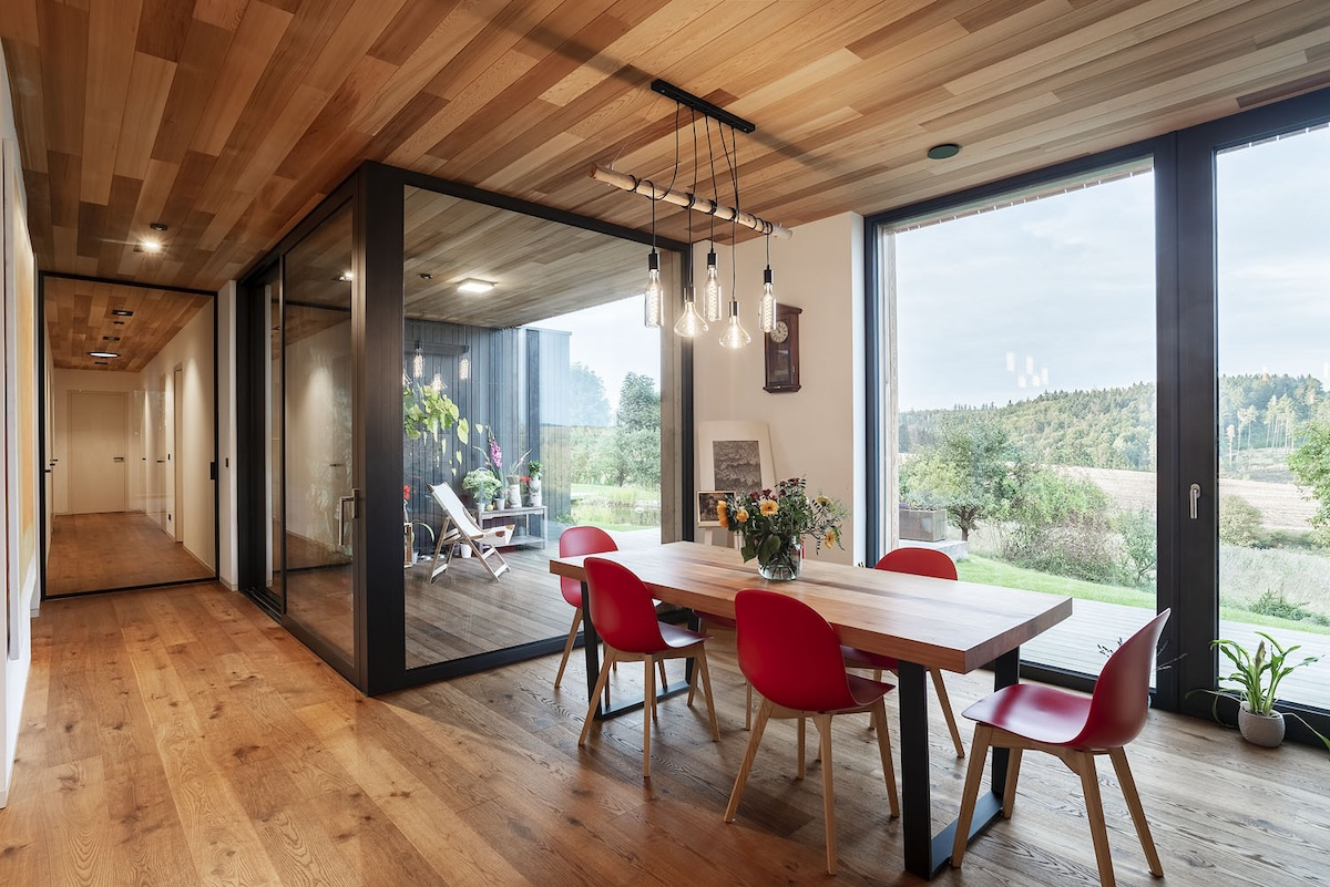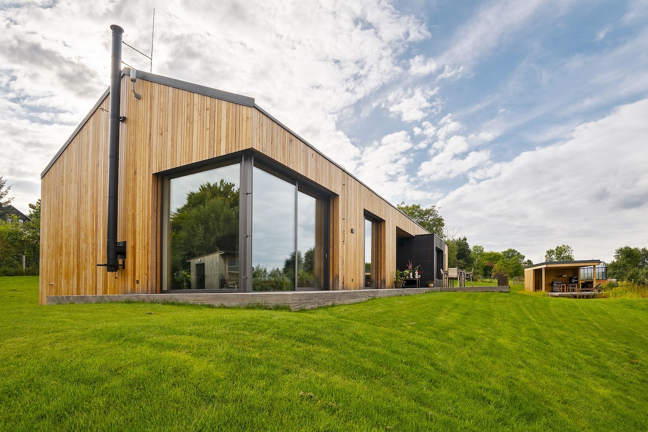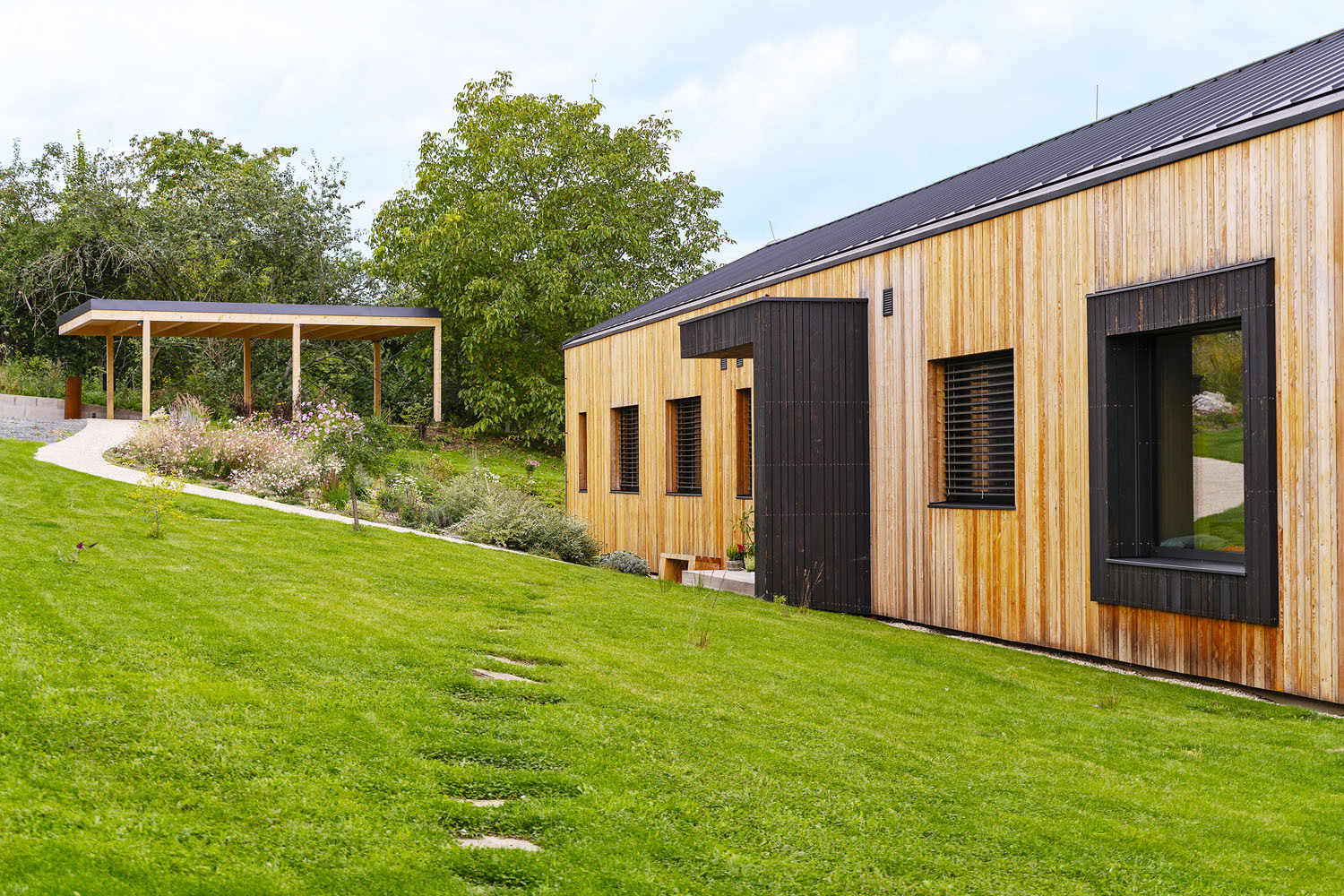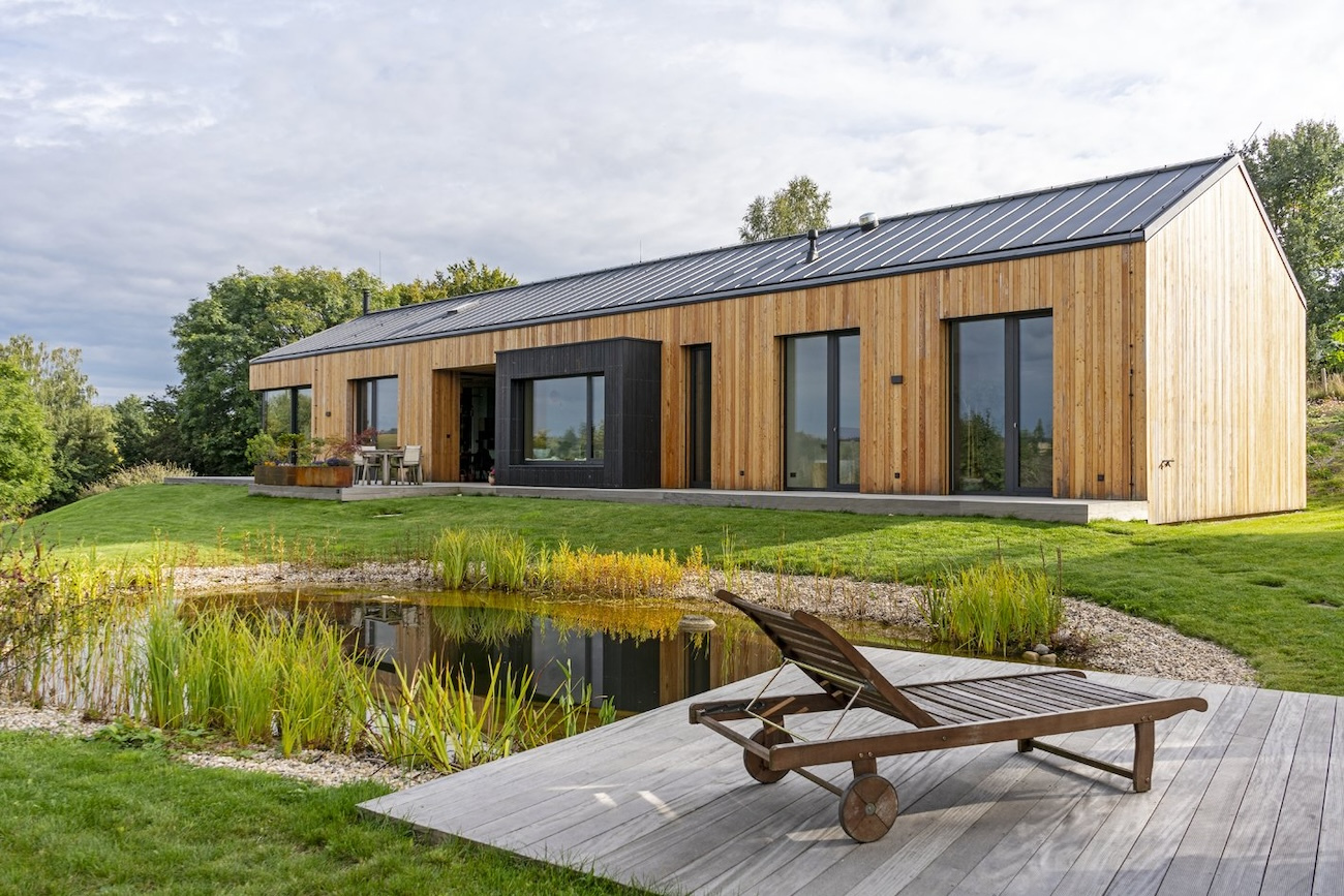 Prízemný dom pretiahnutého tvaru so sedlovou strechou a vertikálnym dreveným obkladom fasády na prvý pohľad pripomína tradičnú vidiecku stodolu, jeho dizajn aj technické riešenia sú však úplne na úrovni 21. storočia. Montovaná konštrukcia zo skrutkovaných drevených DEKPANELOV s väzníkovým krovom a kvalitnými hliníkovými oknami zodpovedá požiadavkám na nízkoenergetický štandard, domácnosť využíva komfort vyspelých technológií, ako je elektrické podlahové vykurovanie a inteligentné riadenie. Hlavný vstup rozdeľuje dispozíciu na spoločnú dennú a súkromnú nočnú časť. Denná časť je otvorená a transparentná, kuchyňa s jedálňou je oddelená od obývacej izby priečkou s posuvnými dverami. Protipólom hlavného vstupu je krytá terasa zapustená do hmoty domu. Pozdĺžna centrálna chodba po ľavej strane vedie do spálňovej časti – sú tu dve izby pre hostí, izba dcéry, apartmán rodičov, dve kúpeľne a technická miestnosť. Pozdĺž celej severovýchodnej fasády prebieha terasa s výstupmi zo všetkých miestností. Architekti dom usporiadali tak, aby takmer všetky obytné miestnosti boli orientované na severovýchod a ťažili z krásneho výhľadu do okolia a na jazierko.