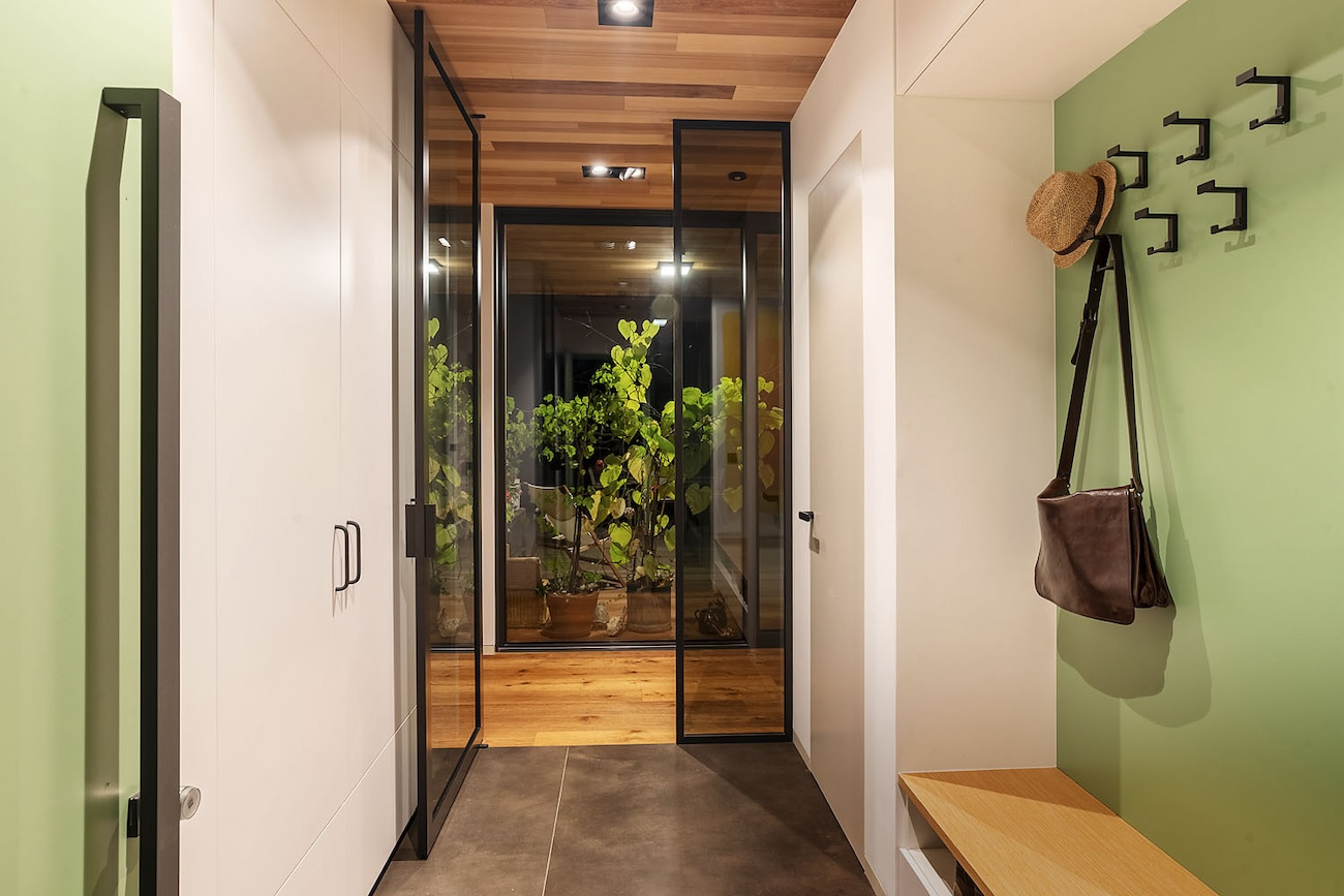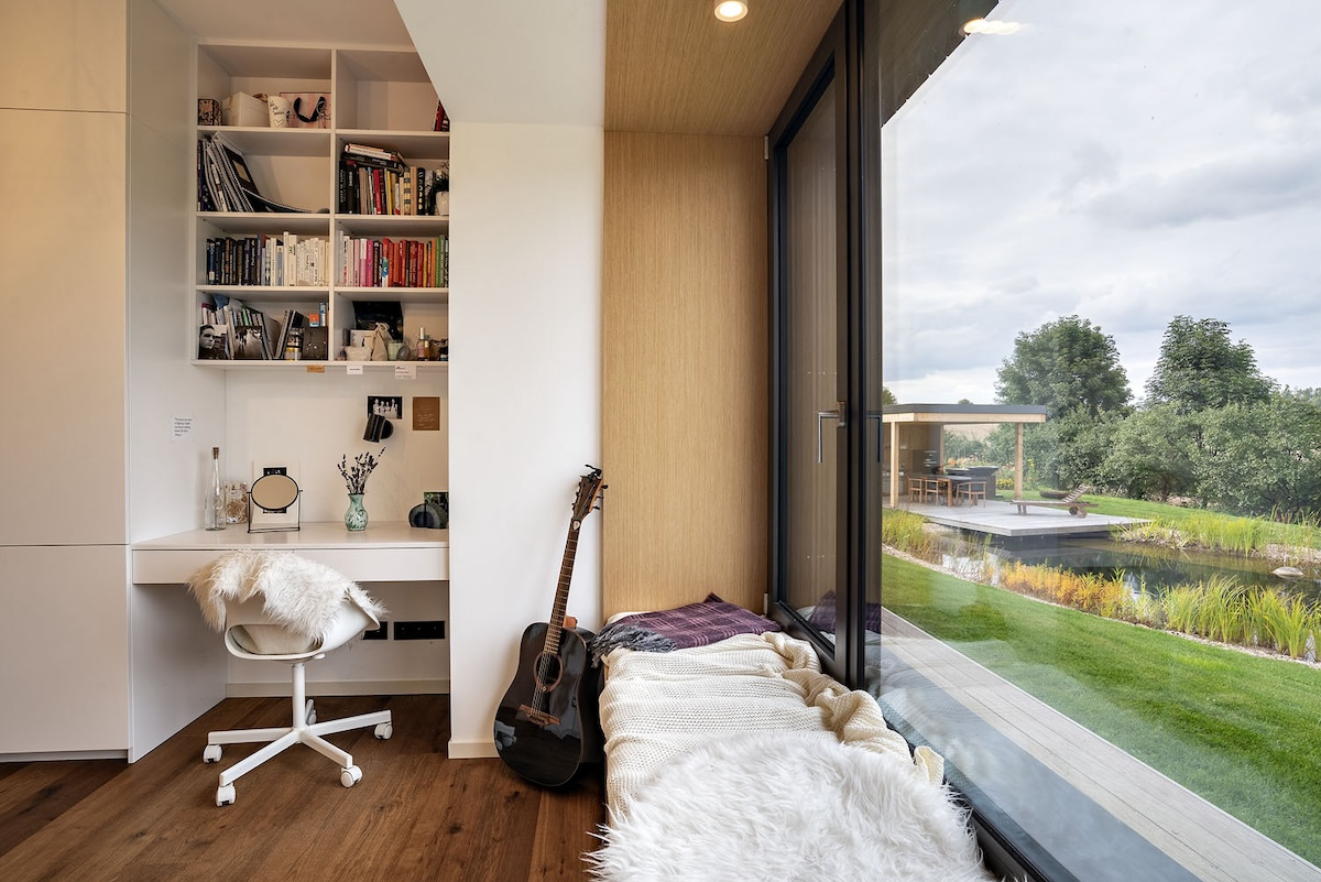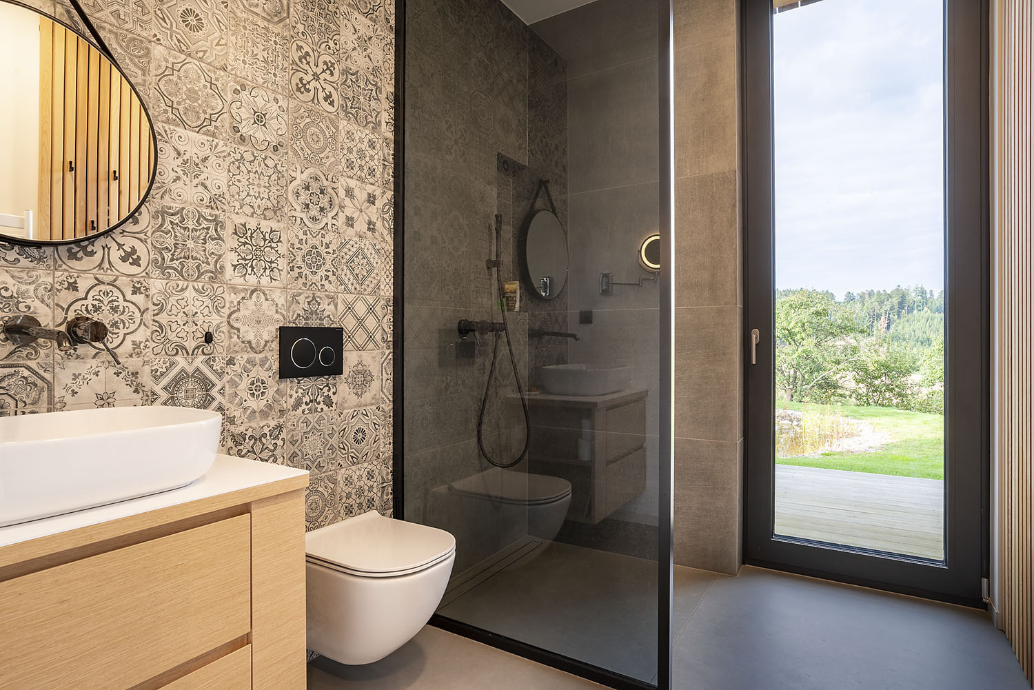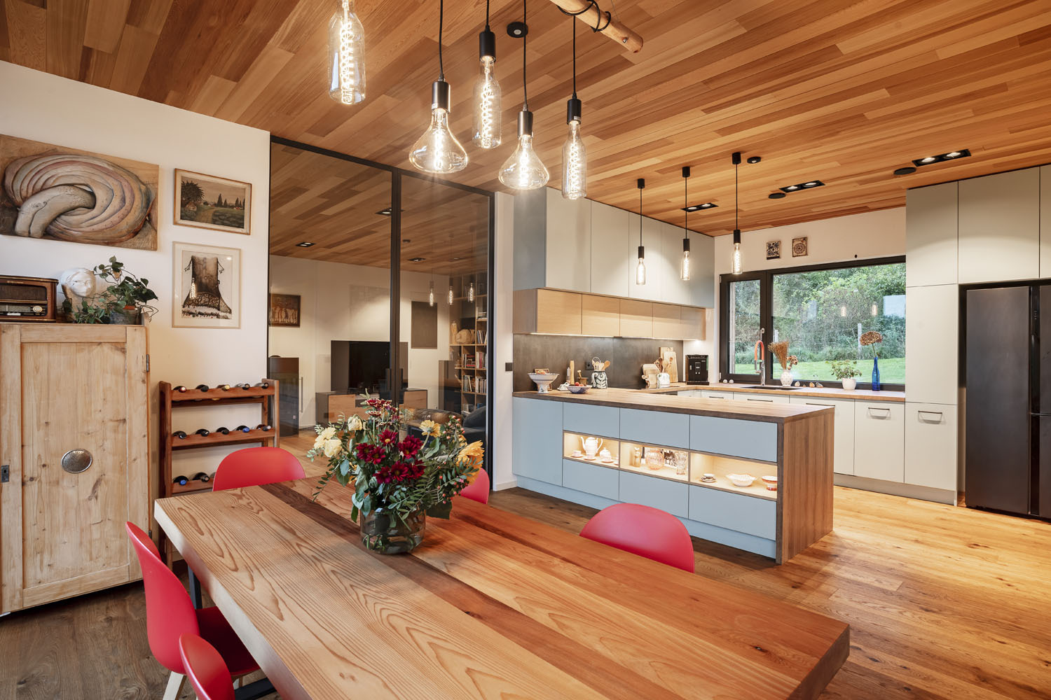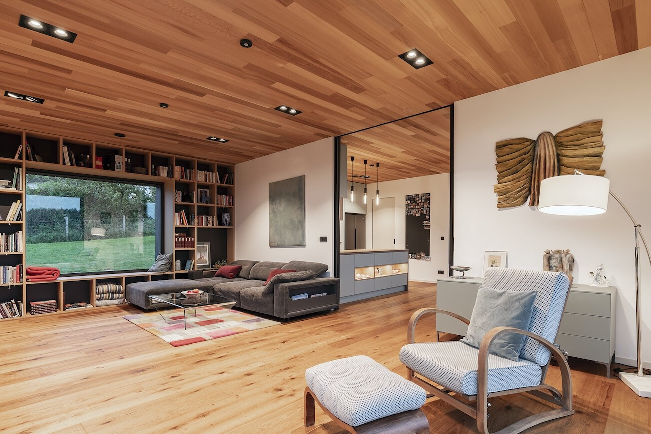 Prízemný dom pretiahnutého tvaru so sedlovou strechou a vertikálnym dreveným obkladom fasády na prvý pohľad pripomína tradičnú vidiecku stodolu, jeho dizajn aj technické riešenia sú však úplne na úrovni 21. storočia. Montovaná konštrukcia zo skrutkovaných drevených DEKPANELOV s väzníkovým krovom a kvalitnými hliníkovými oknami zodpovedá požiadavkám na nízkoenergetický štandard, domácnosť využíva komfort vyspelých technológií, ako je elektrické podlahové vykurovanie a inteligentné riadenie. Hlavný vstup rozdeľuje dispozíciu na spoločnú dennú a súkromnú nočnú časť. Denná časť je otvorená a transparentná, kuchyňa s jedálňou je oddelená od obývacej izby priečkou s posuvnými dverami. Protipólom hlavného vstupu je krytá terasa zapustená do hmoty domu. Pozdĺžna centrálna chodba po ľavej strane vedie do spálňovej časti – sú tu dve izby pre hostí, izba dcéry, apartmán rodičov, dve kúpeľne a technická miestnosť. Pozdĺž celej severovýchodnej fasády prebieha terasa s výstupmi zo všetkých miestností. Architekti dom usporiadali tak, aby takmer všetky obytné miestnosti boli orientované na severovýchod a ťažili z krásneho výhľadu do okolia a na jazierko.