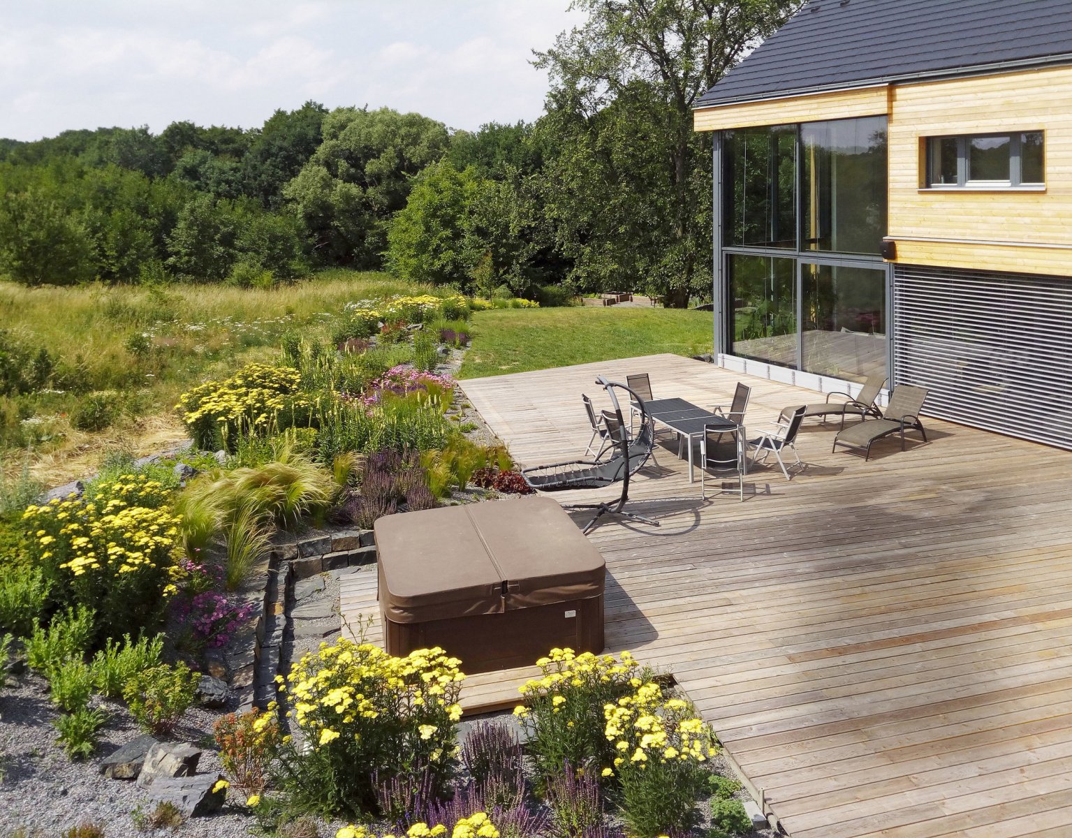 Z projektu možno vyčítať, že všetko sa premyslelo a do detailu aj prediskutovalo tak po stránke architektonickej, ako aj po stránke využitia flóry. Priestor s terasou prirodzene nadväzuje na centrálny pobytový trávnik, ďalej pokračuje kvetnatá lúka, ktorá prechádza do ovocného sadu až k okraju lesa. Zastaviť môžete pred úžitkovou záhradou s posedením pri ohni v tieni vysokého brestu.