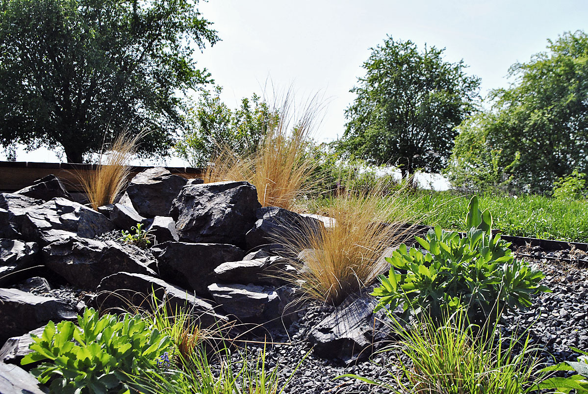 Záhrada s dominantným vysokým brestom v tesnej blízkosti rodinného domu vytvára rozšírený obytný priestor s možnosťou aktívneho vyžitia terasy, strešnej záhrady aj trávnika. Prevažuje tu výsadba stepných a lesných druhov v nadväznosti na okolitú prírodu.